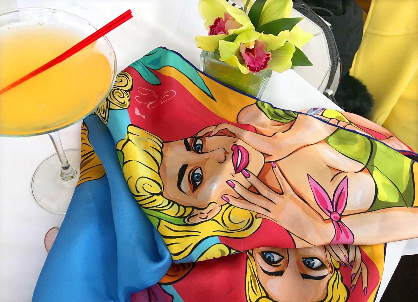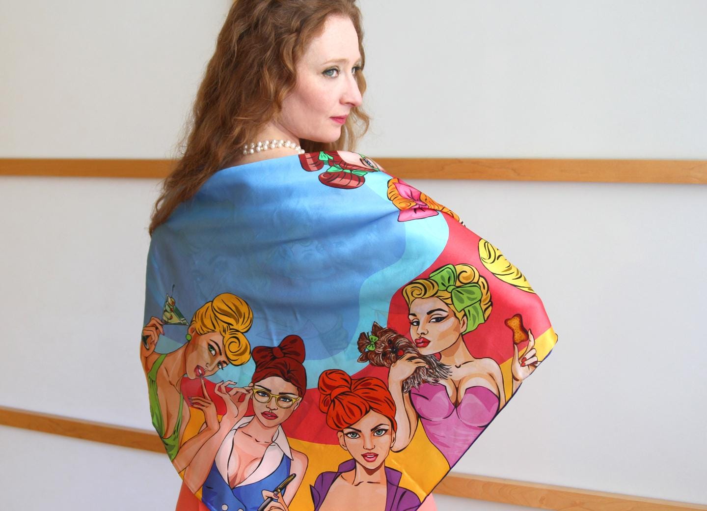 A meaningful gift for her who’s got style and secrets💋 and never leaves home without her silk scarf. This luxury 36"x36" pure silk charmeuse scarf is a love letter to the bold, the playful, the gloriously extra - featuring pinup icons sipping martinis, holding cupcakes, and flipping their hair with a wink, all rendered in vibrant pop-art colors.