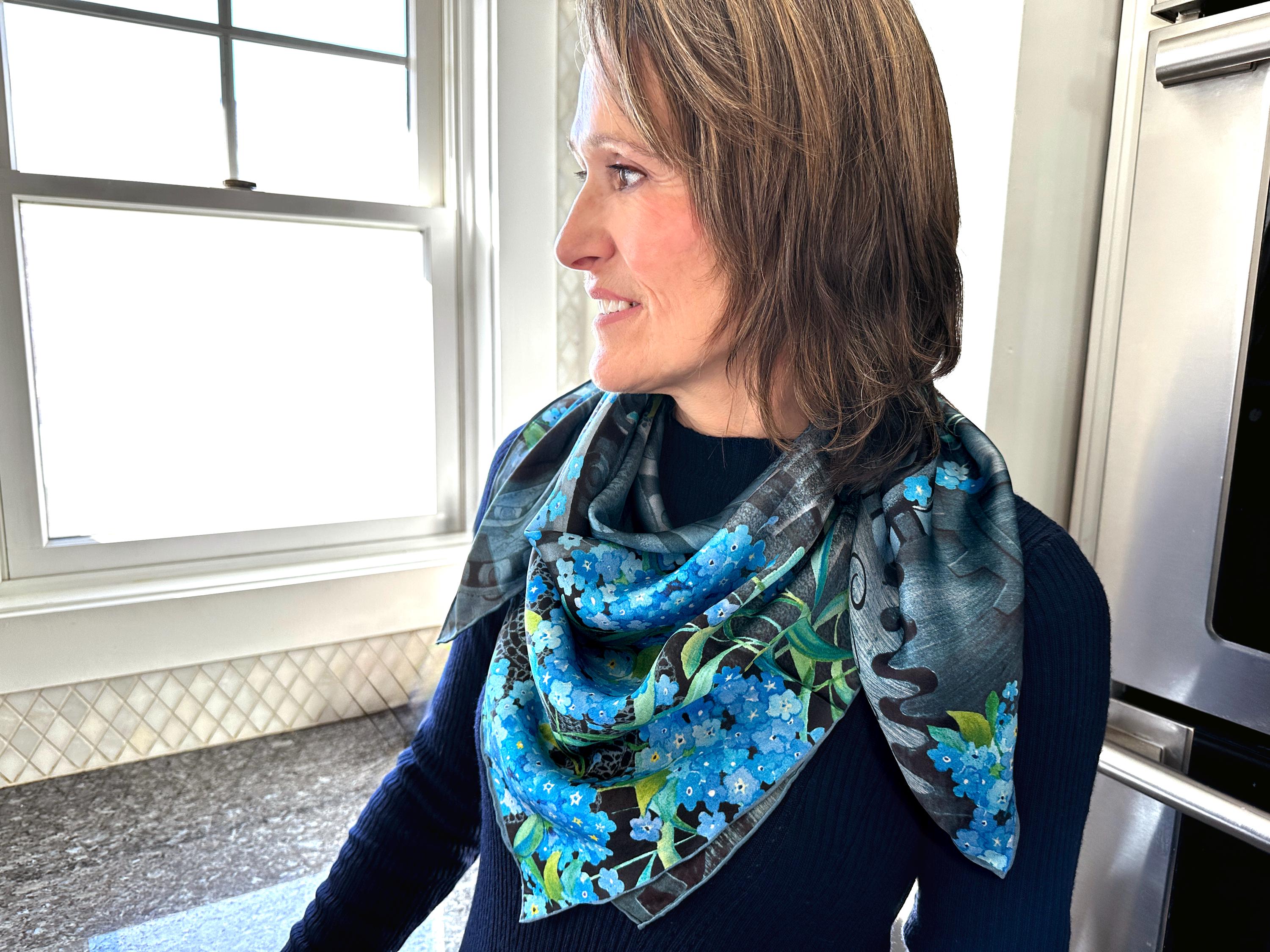 A meaningful gift for her who owns her power. ⚙️ This luxury 36"x36" pure silk charmeuse scarf blends steampunk precision with floral tenderness: intricate gears, ball bearings, and lace intertwine with delicate blue forget-me-nots - a visual meditation on the balance between logic and love, structure and soul. It’s for the woman who leads with both heart and mind - the thinker, the doer, the quietly brilliant soul who knows that true elegance requires consistency, focus, and the courage to be vulnerable. “On my 40th birthday, I wore ‘Forget-Me-Nots’ and toasted my quiet brilliance. Greatness isn’t loud. It’s steady. And it’s mine.”