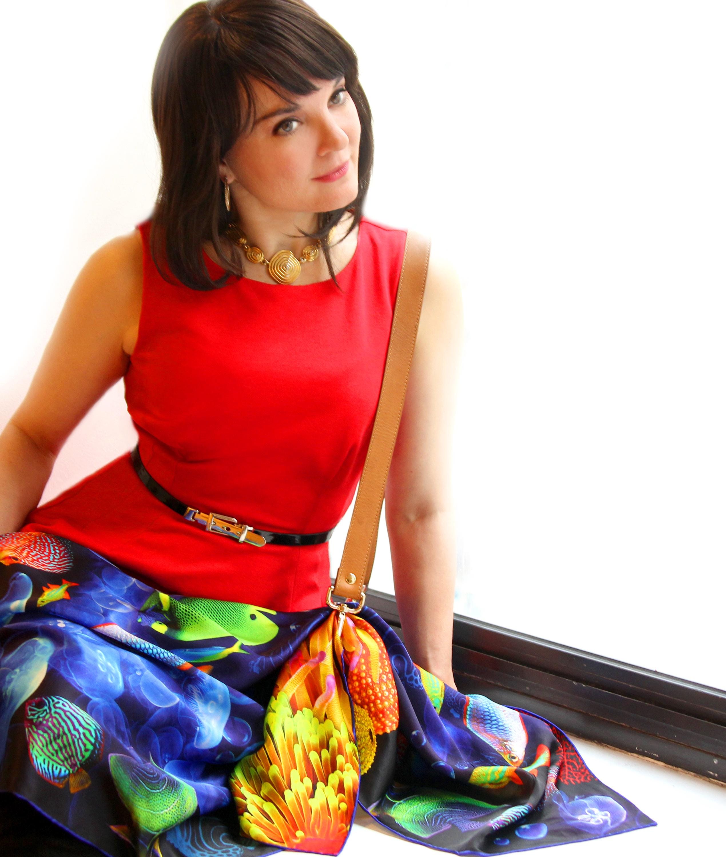 This luxury 36"x36" pure silk charmeuse scarf blooms with tropical angel fish, glowing jellyfish, delicate coral formations, rising bubbles, and a mysterious lost keyâa visual poem for the soulful seeker.