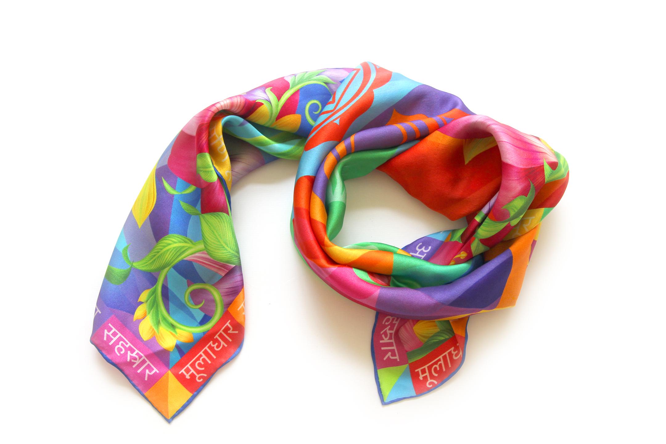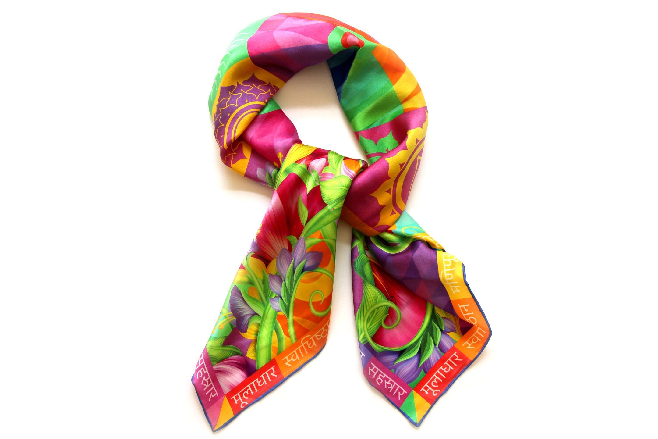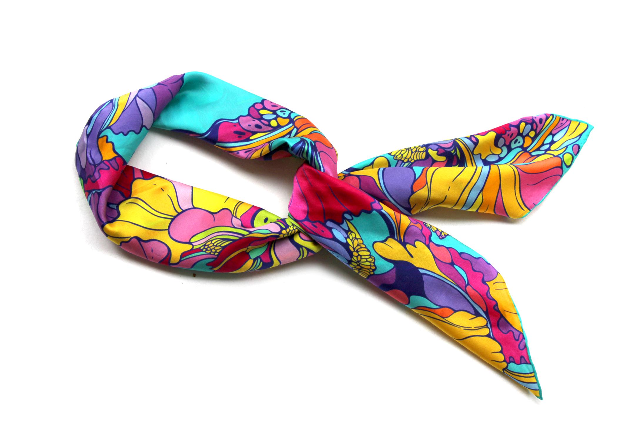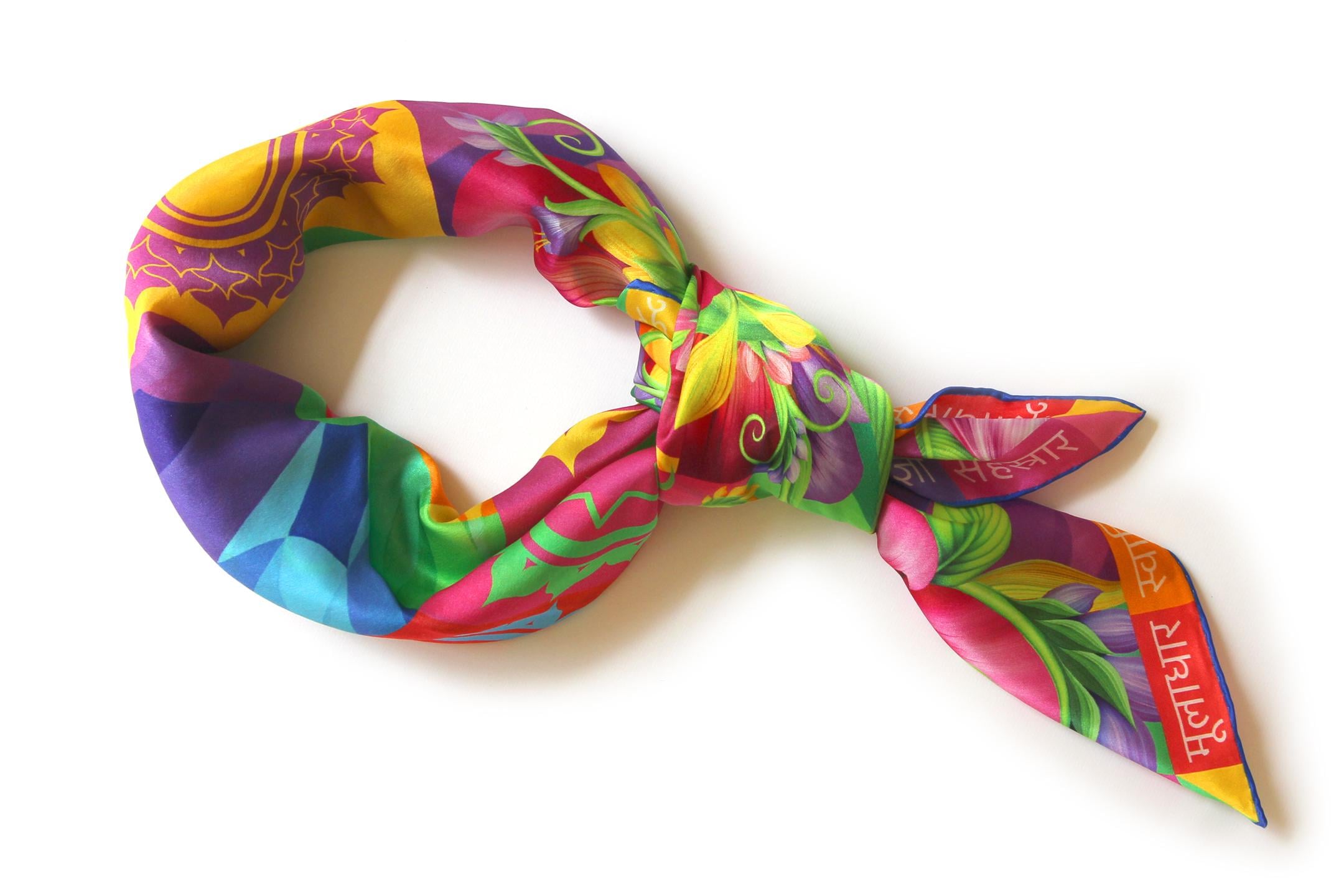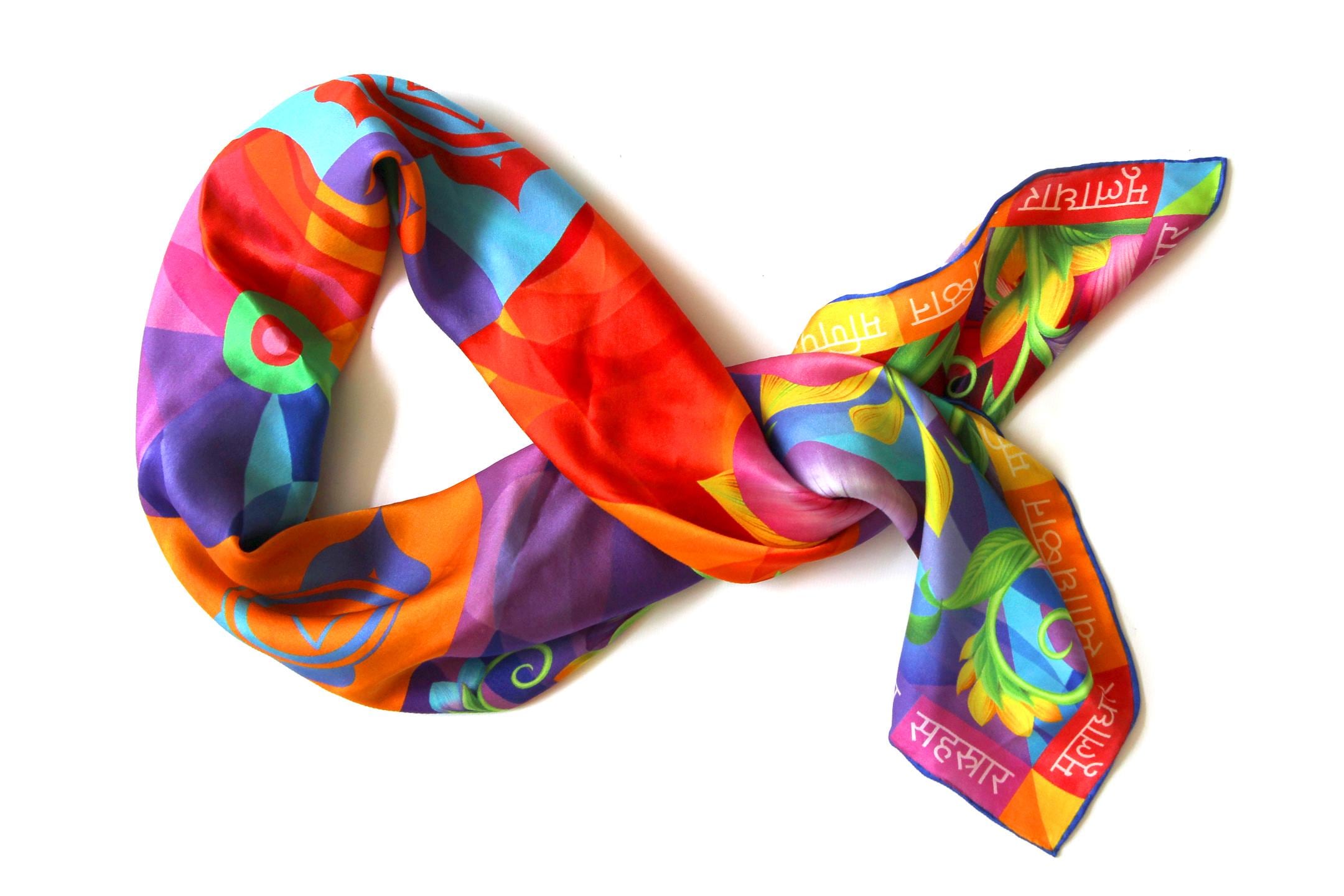 Fold your silk scarf to a triangle: With triangle pointing down your chest, cross the ends on the back of your neck and pull them to rest on your chest. If the scarf has a symmetrical design relying on a repetitive pattern, same in every quarter, this loop ends up nondescript and banal. However with the Palace Affair scarves, featuring organic and asymetrical distribution of design elements and color, this is a great tie, bringing together contrasting or complementary colors and swirls of imagery from different quarters of the scarf.
