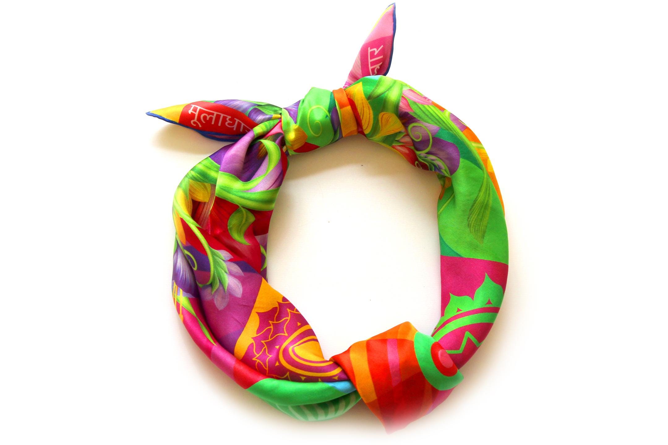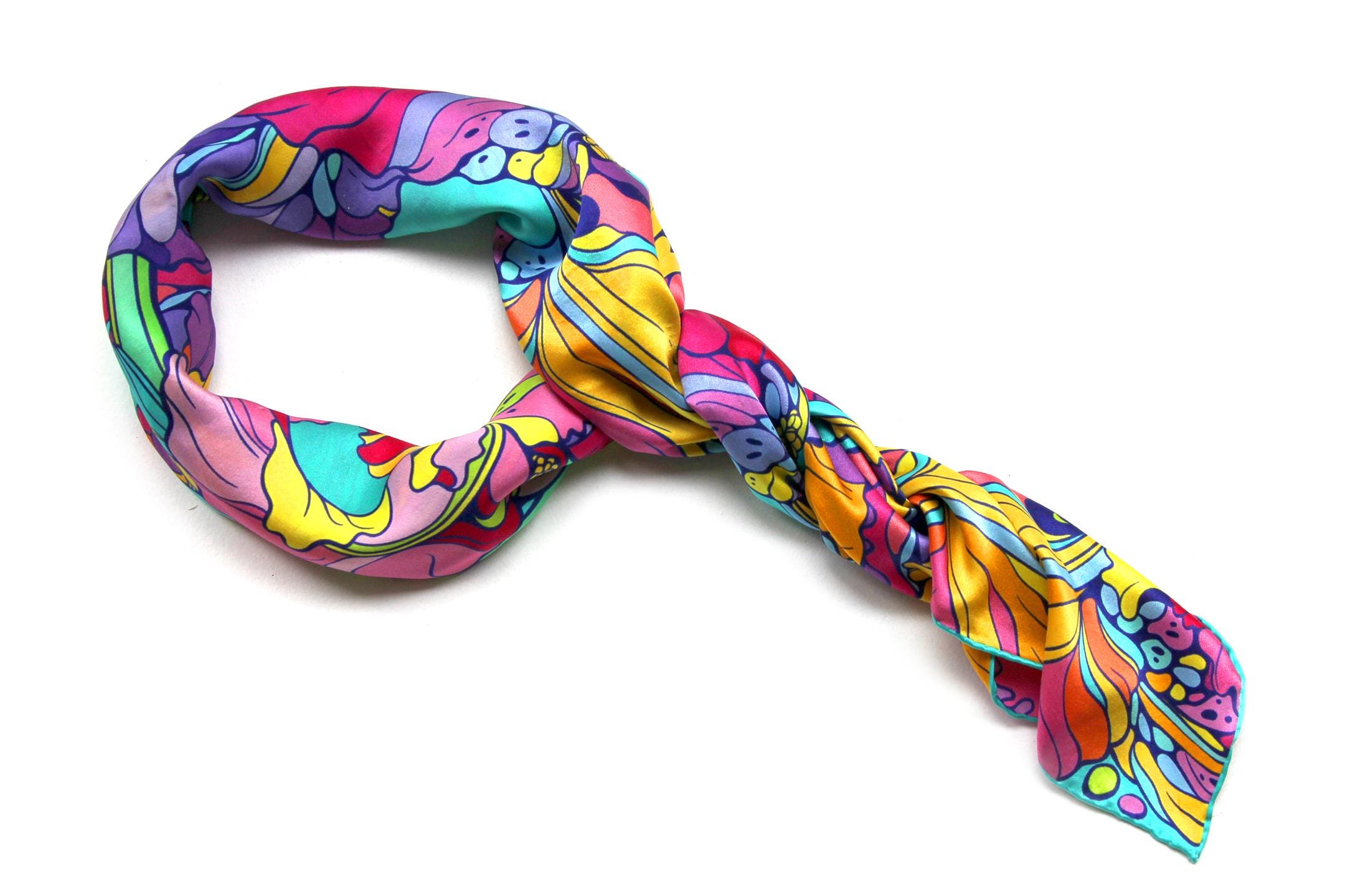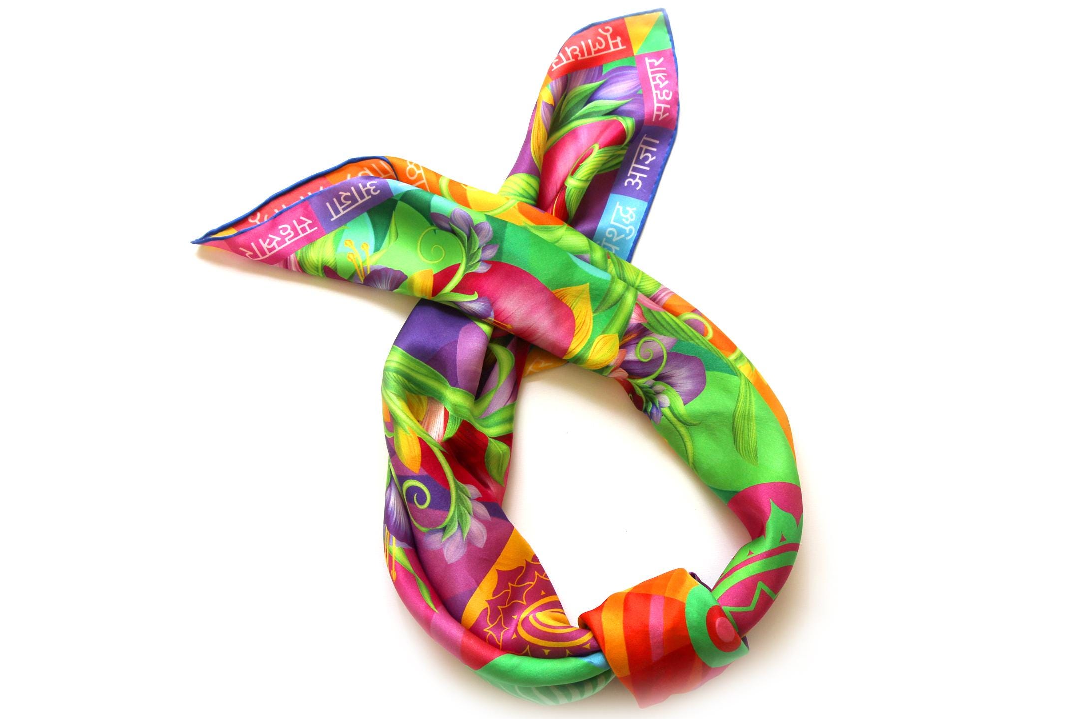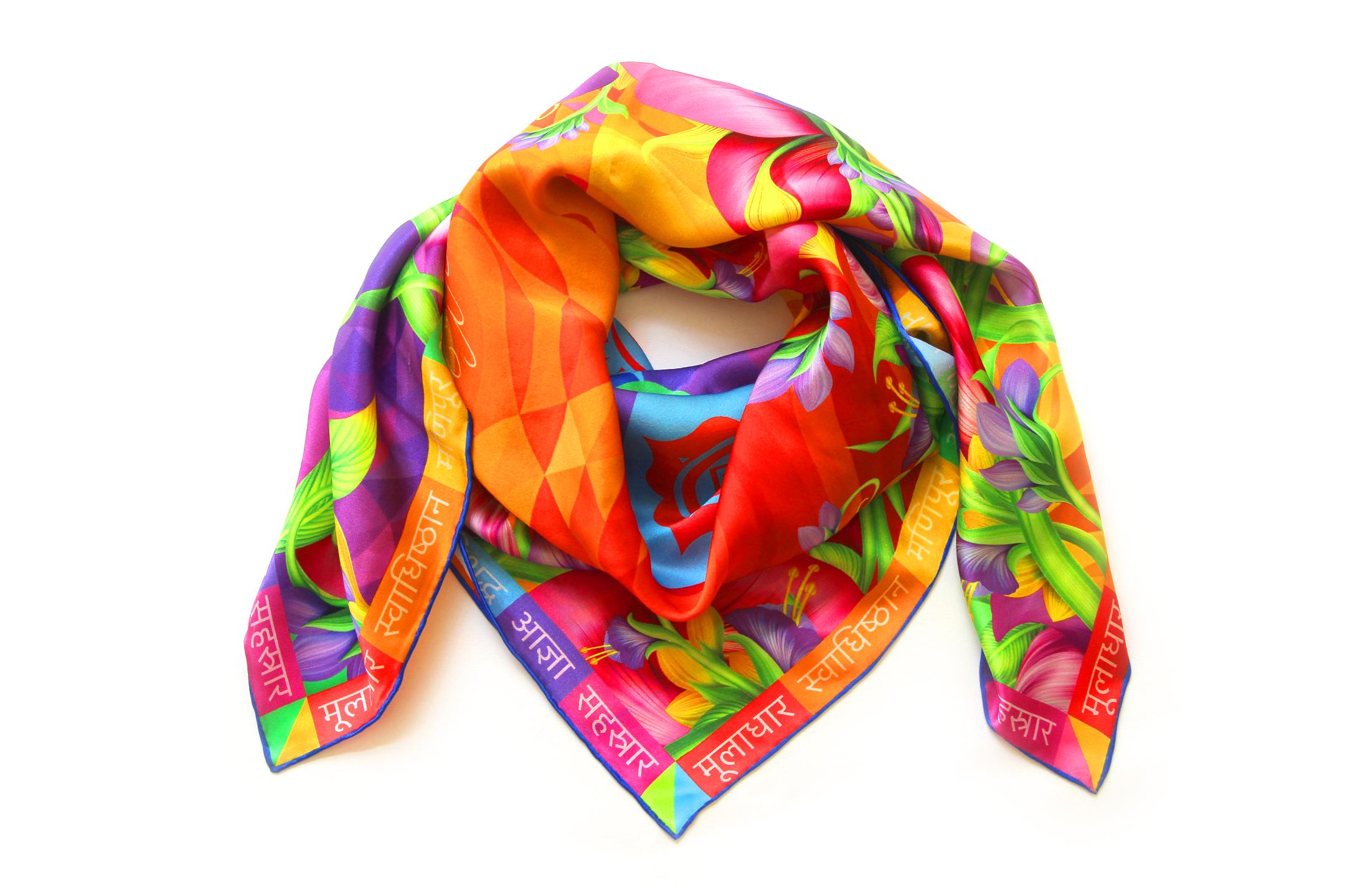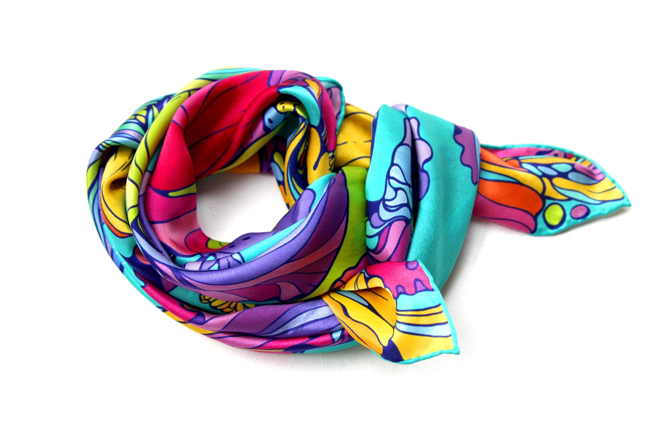 Fold your silk scarf to a triangle: With triangle pointing down your chest, cross the ends on the back of your neck and pull them to rest on your chest. If the scarf has a symmetrical design relying on a repetitive pattern, same in every quarter, this loop ends up nondescript and banal. However with the Palace Affair scarves, featuring organic and asymetrical distribution of design elements and color, this is a great tie, bringing together contrasting or complementary colors and swirls of imagery from different quarters of the scarf.