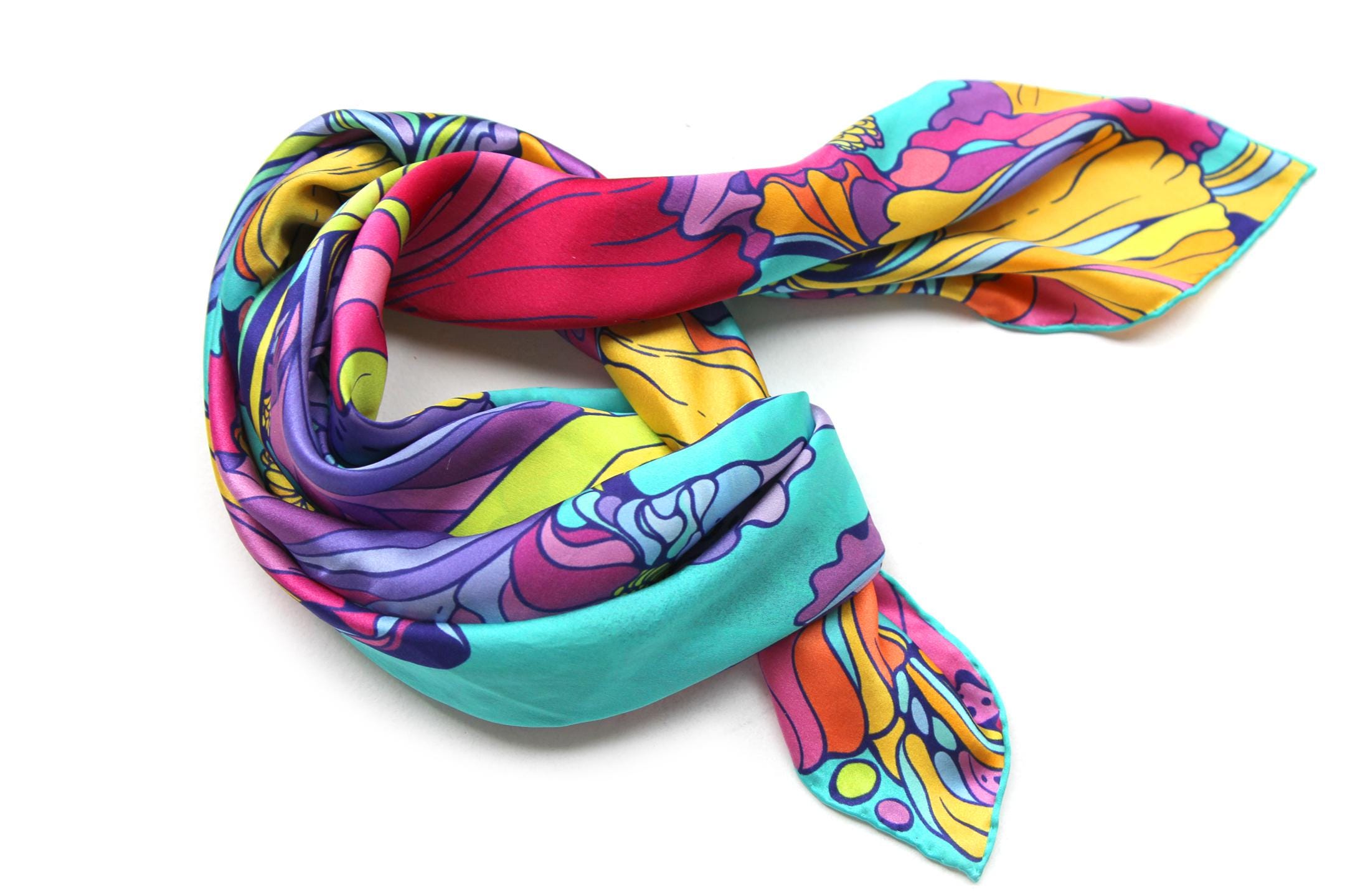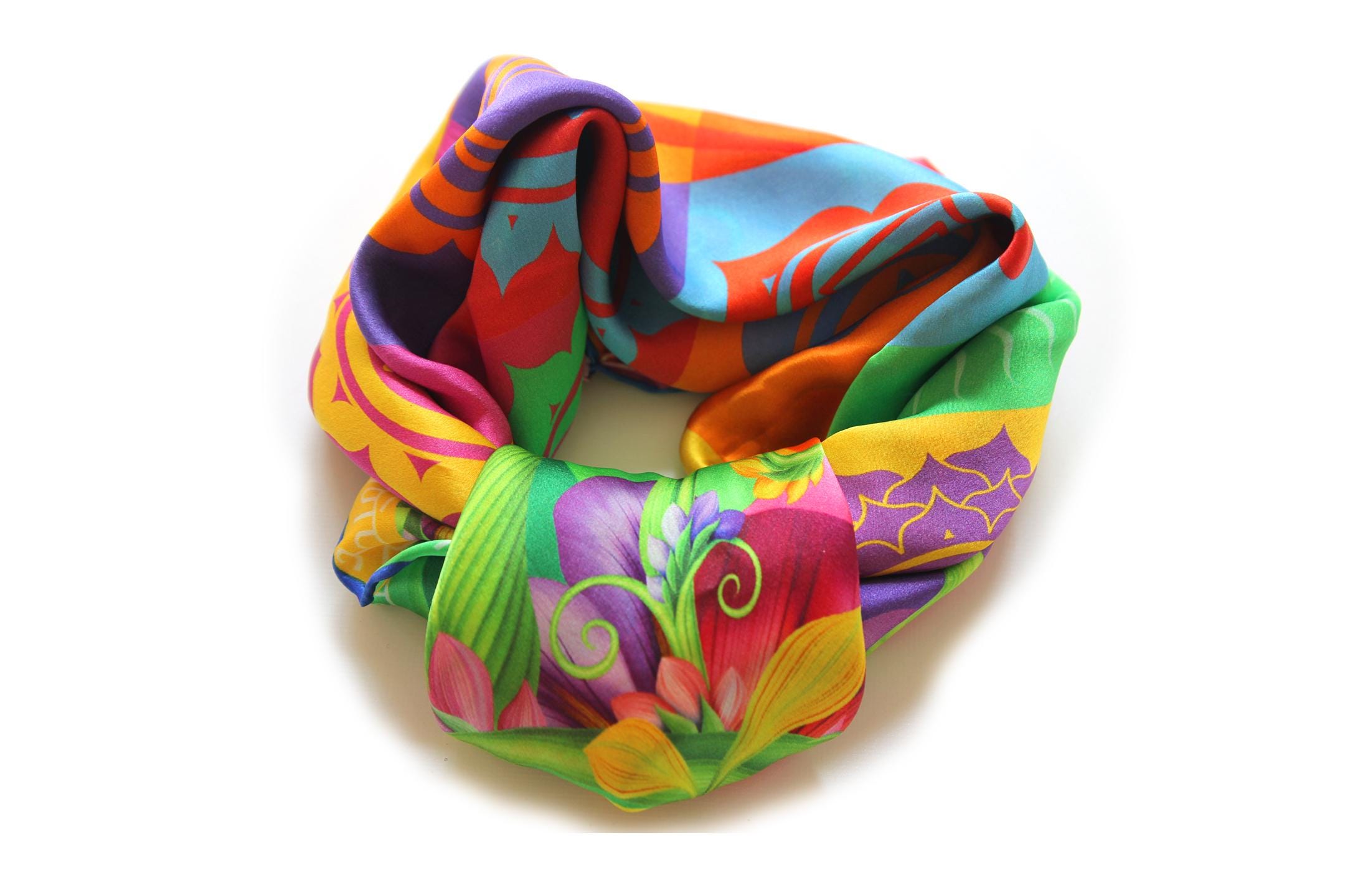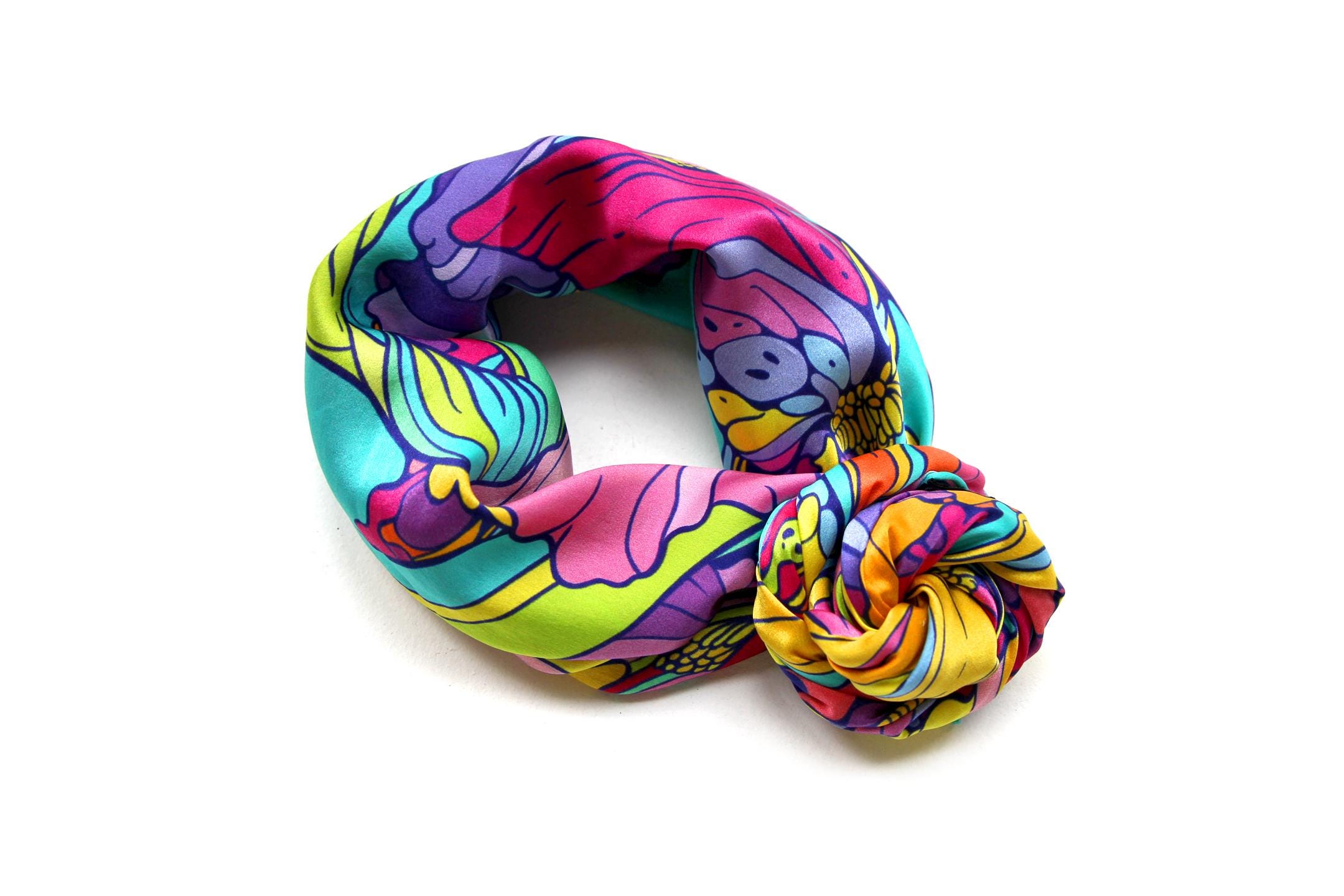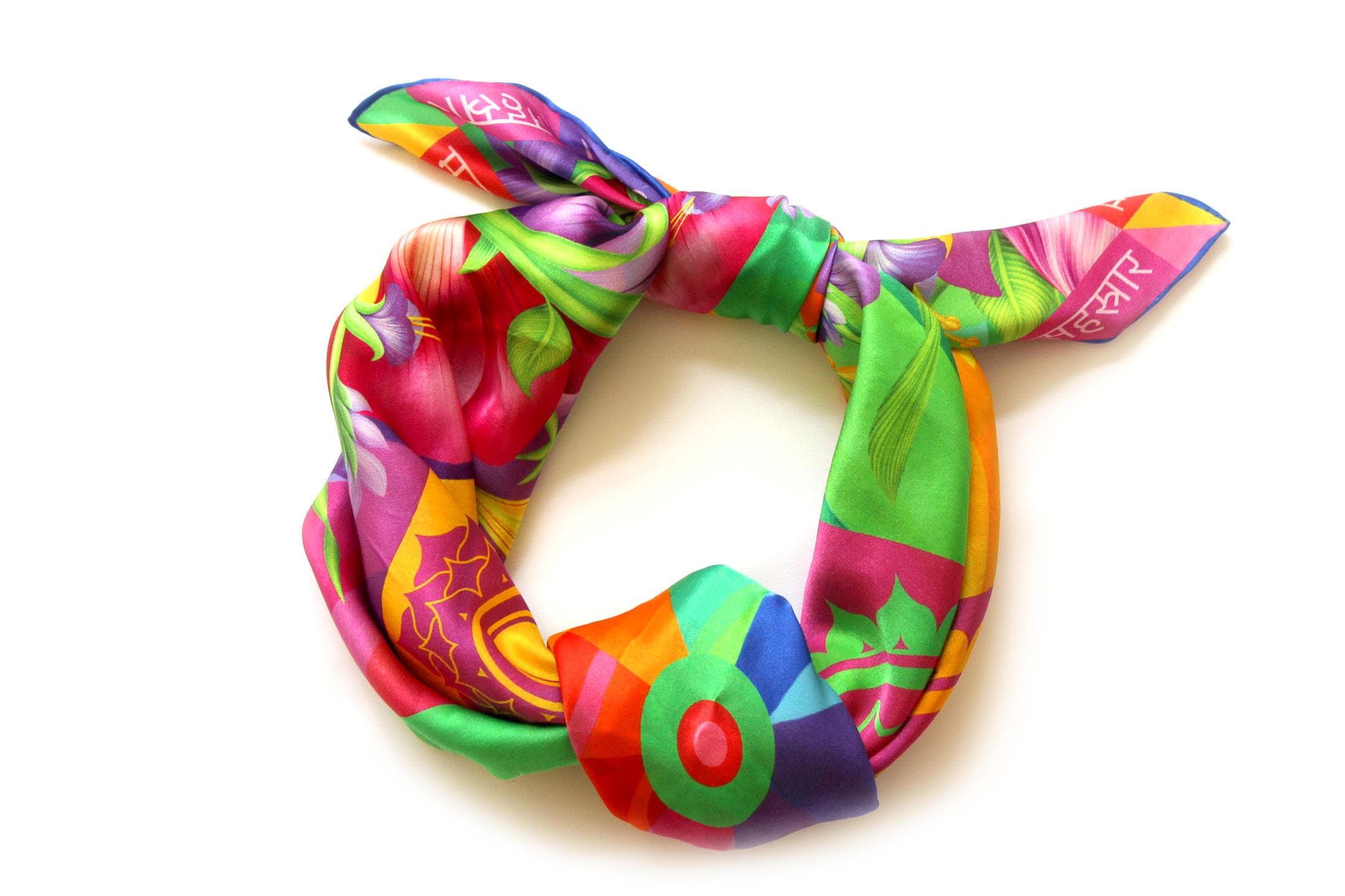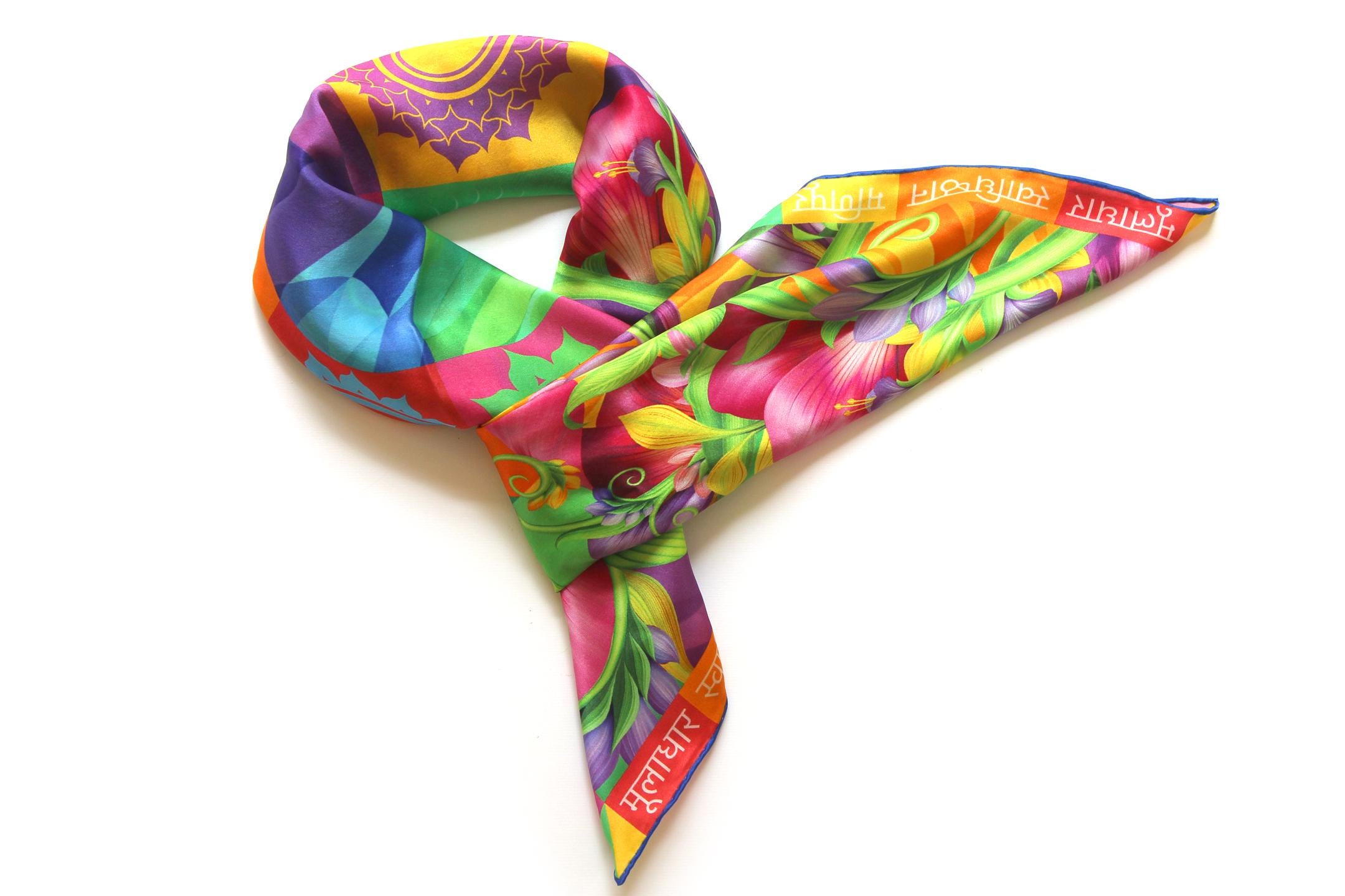 Fold your silk scarf to a triangle: With triangle pointing down your chest, cross the ends on the back of your neck and pull them to rest on your chest. If the scarf has a symmetrical design relying on a repetitive pattern, same in every quarter, this loop ends up nondescript and banal. However with the Palace Affair scarves, featuring organic and asymetrical distribution of design elements and color, this is a great tie, bringing together contrasting or complementary colors and swirls of imagery from different quarters of the scarf.
