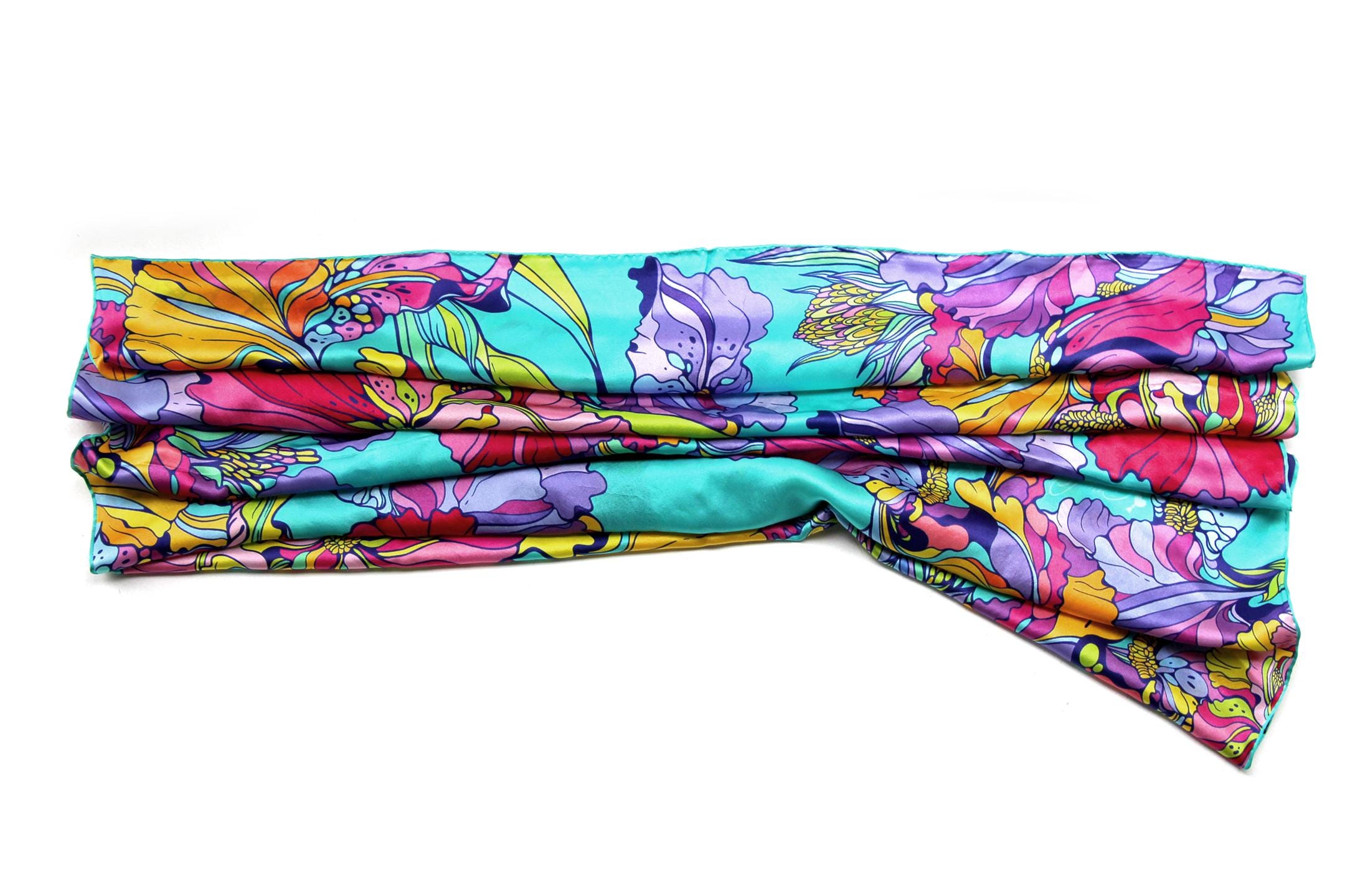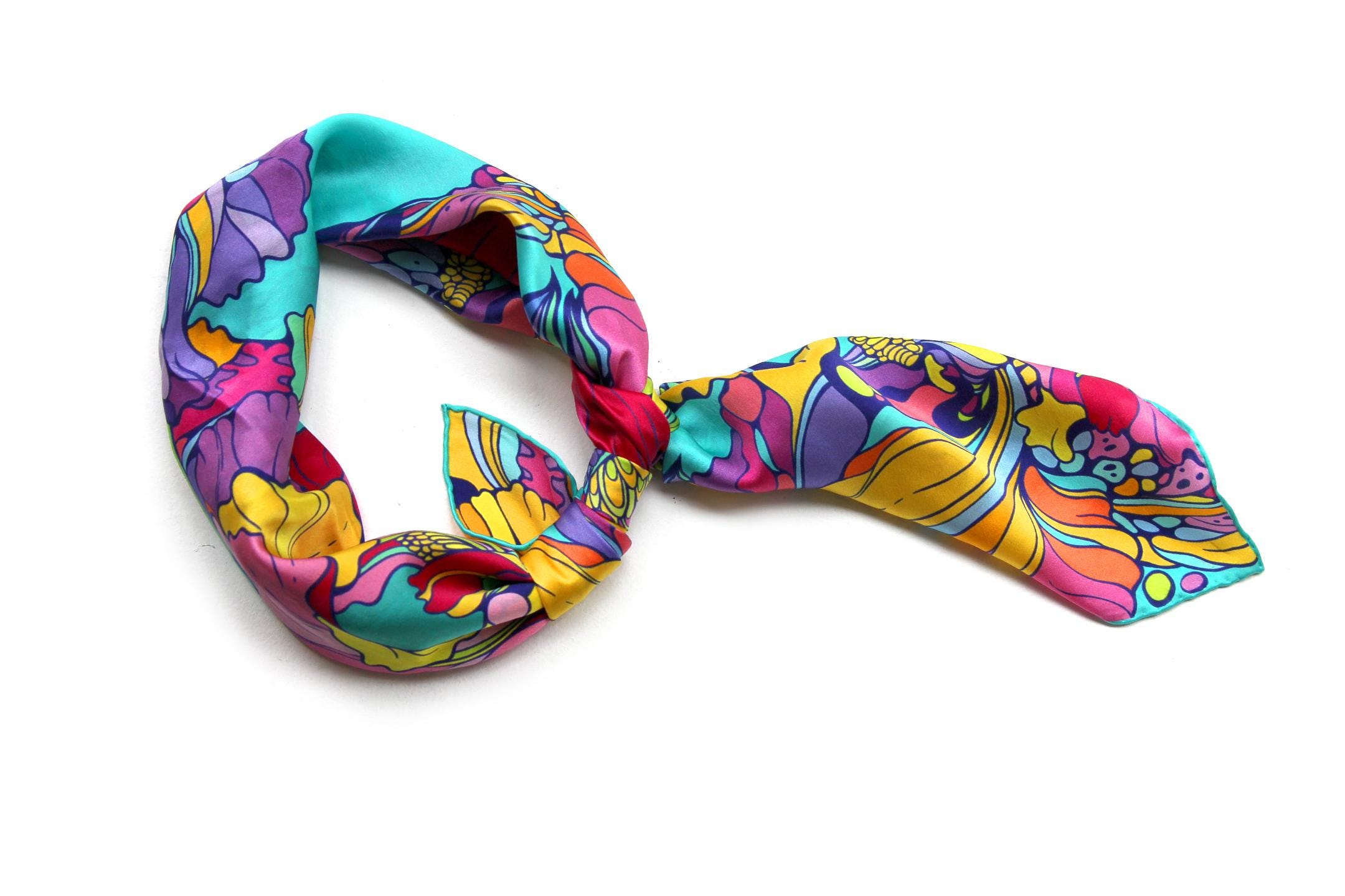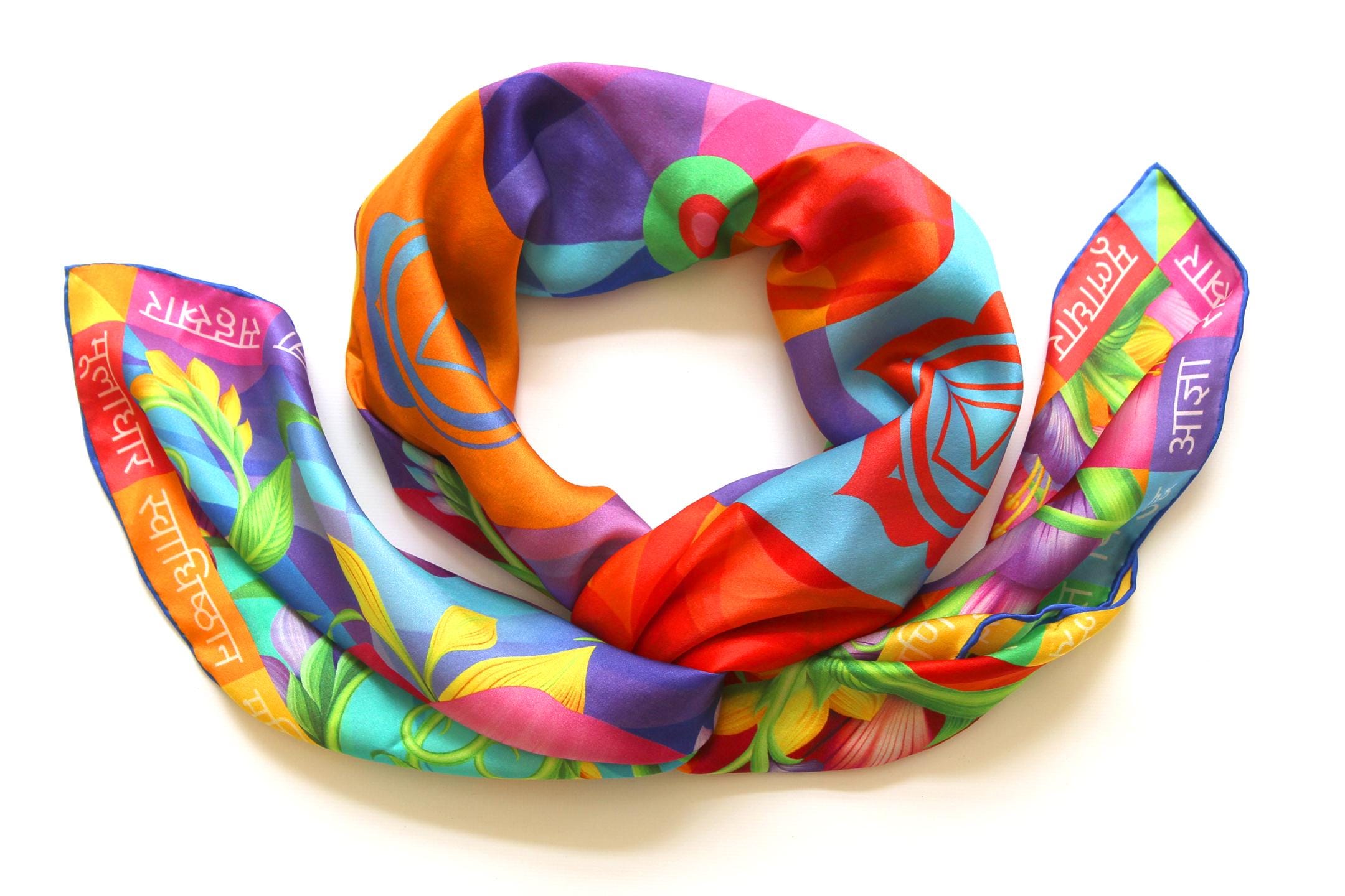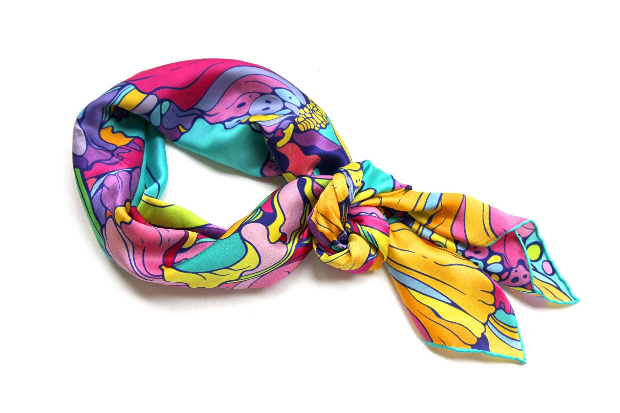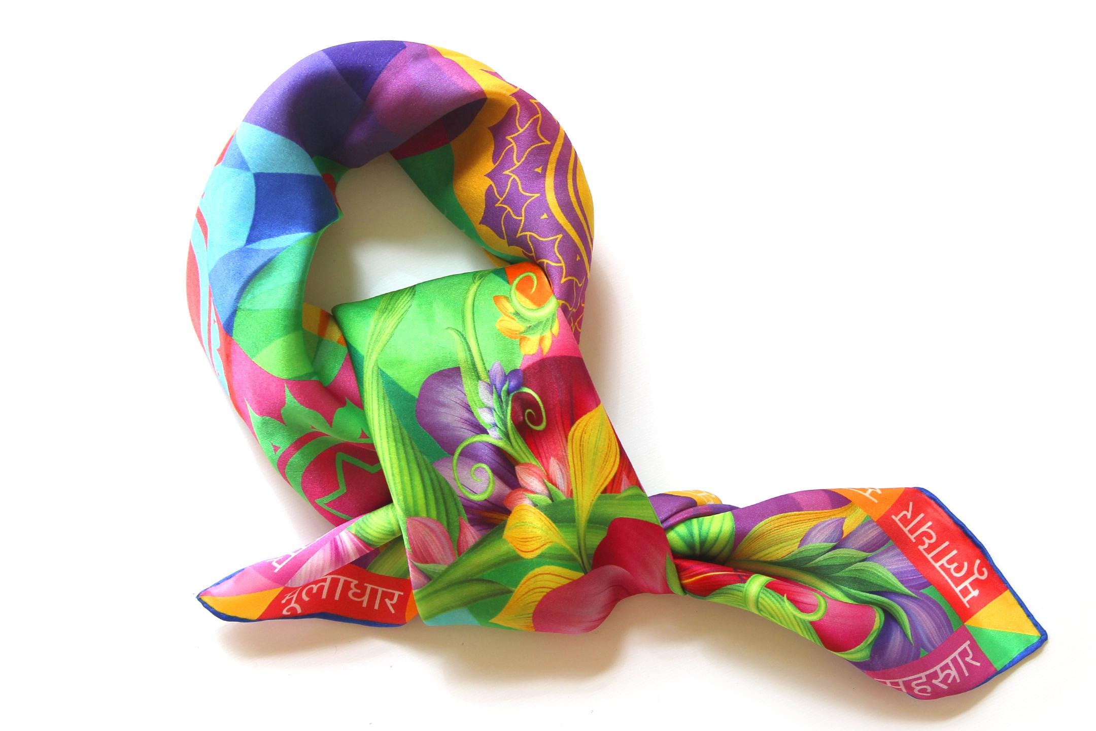 Fold your silk scarf to a triangle: With triangle pointing down your chest, cross the ends on the back of your neck and pull them to rest on your chest. If the scarf has a symmetrical design relying on a repetitive pattern, same in every quarter, this loop ends up nondescript and banal. However with the Palace Affair scarves, featuring organic and asymetrical distribution of design elements and color, this is a great tie, bringing together contrasting or complementary colors and swirls of imagery from different quarters of the scarf.