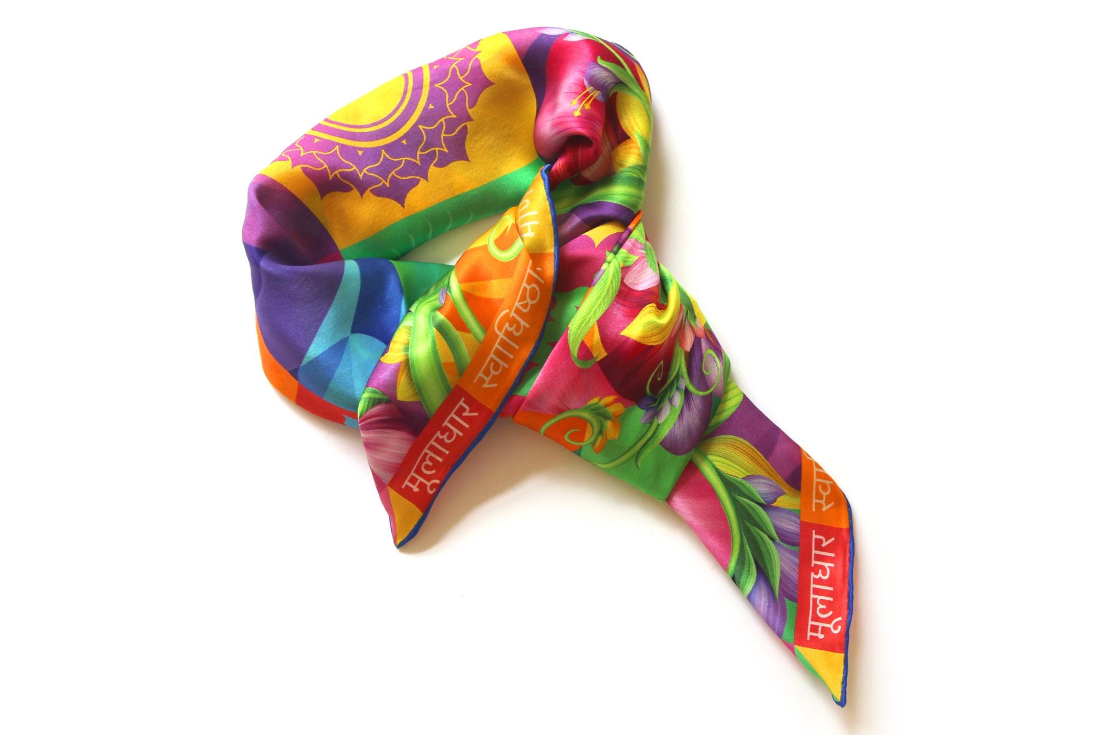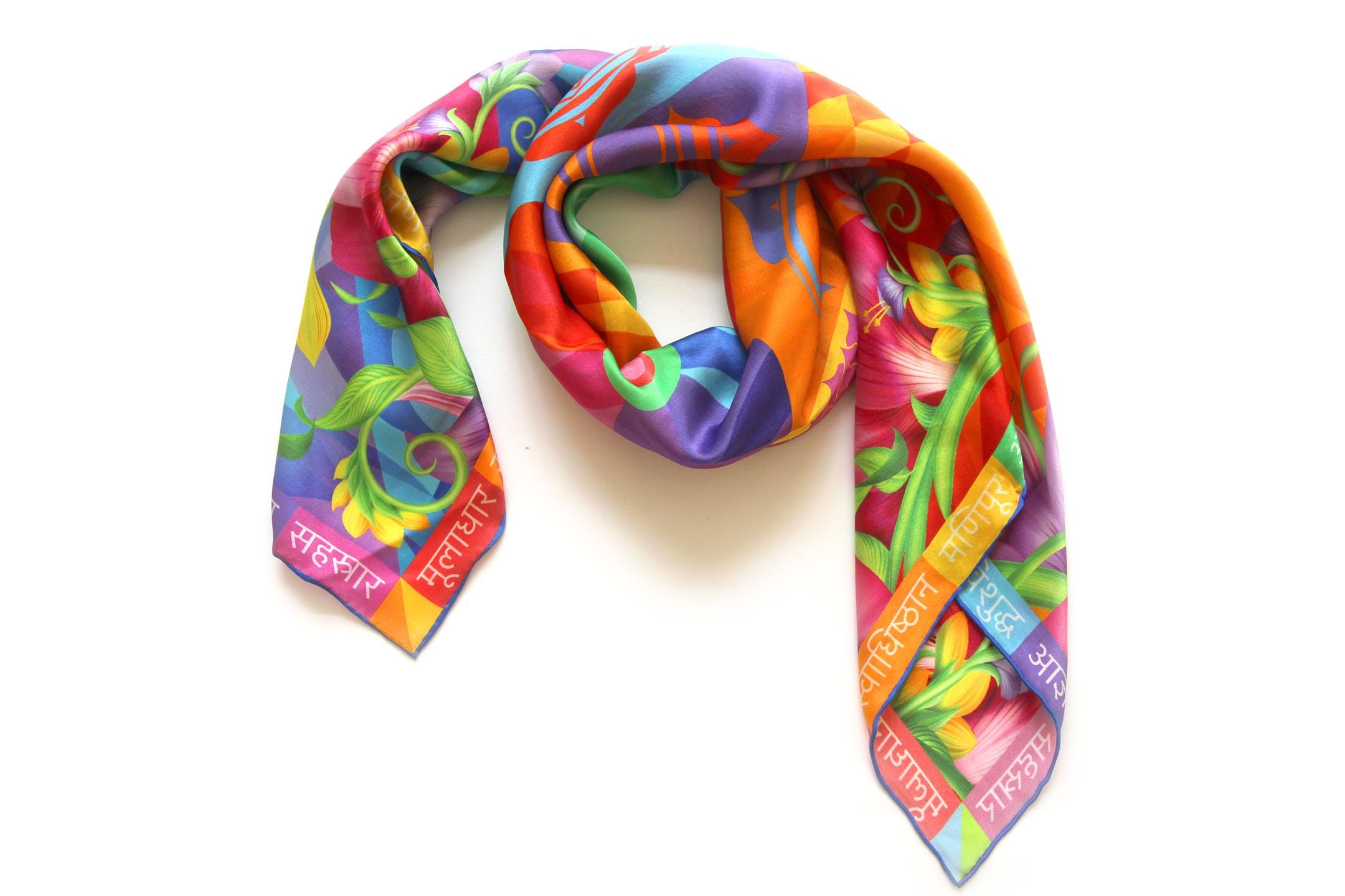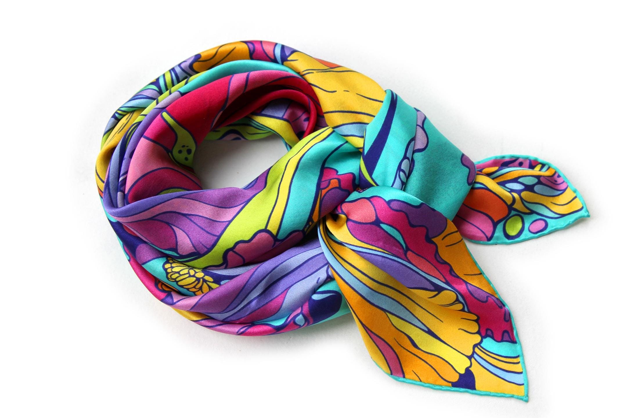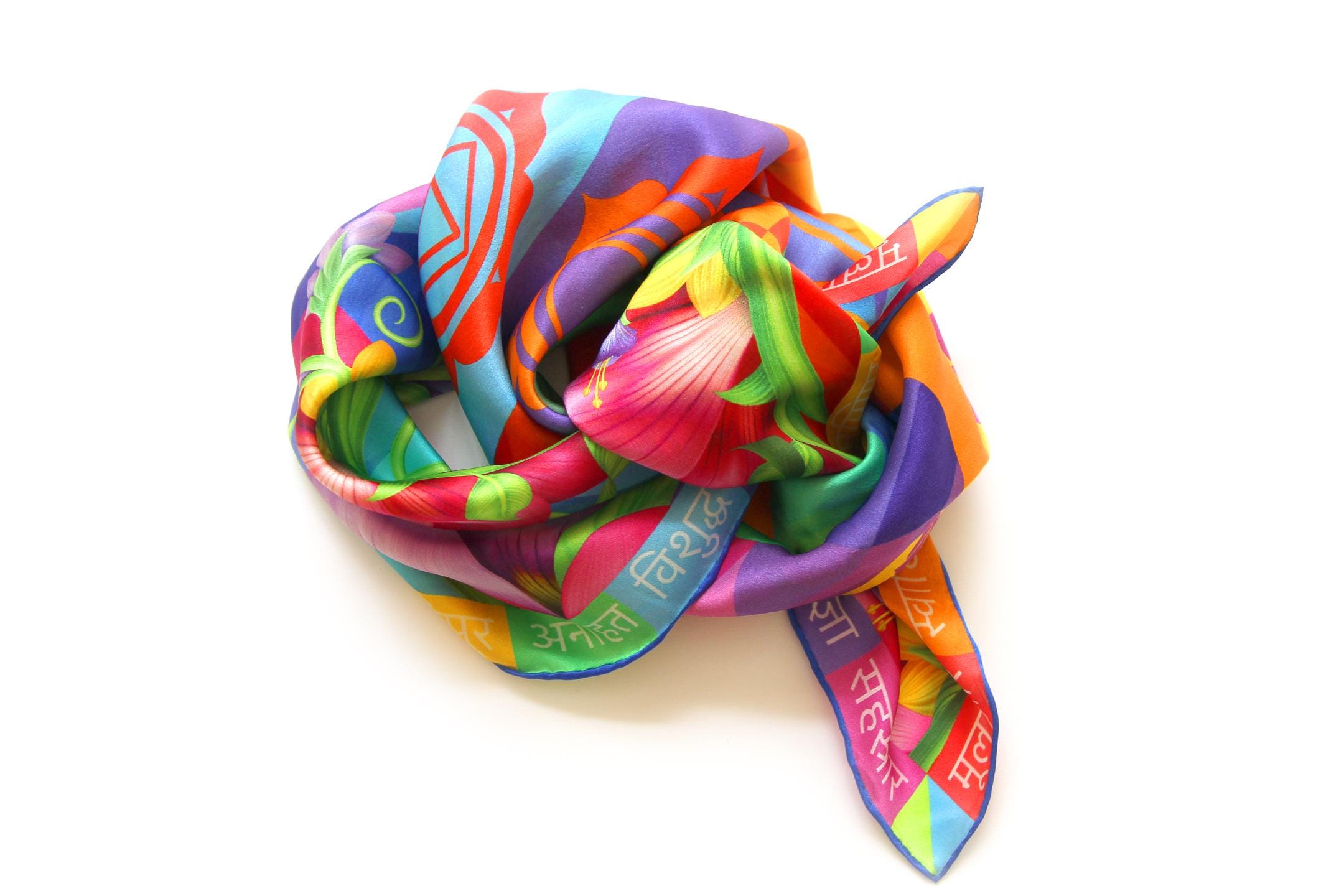 Fold your silk scarf to a triangle: With triangle pointing down your chest, cross the ends on the back of your neck and pull them to rest on your chest. If the scarf has a symmetrical design relying on a repetitive pattern, same in every quarter, this loop ends up nondescript and banal. However with the Palace Affair scarves, featuring organic and asymetrical distribution of design elements and color, this is a great tie, bringing together contrasting or complementary colors and swirls of imagery from different quarters of the scarf.