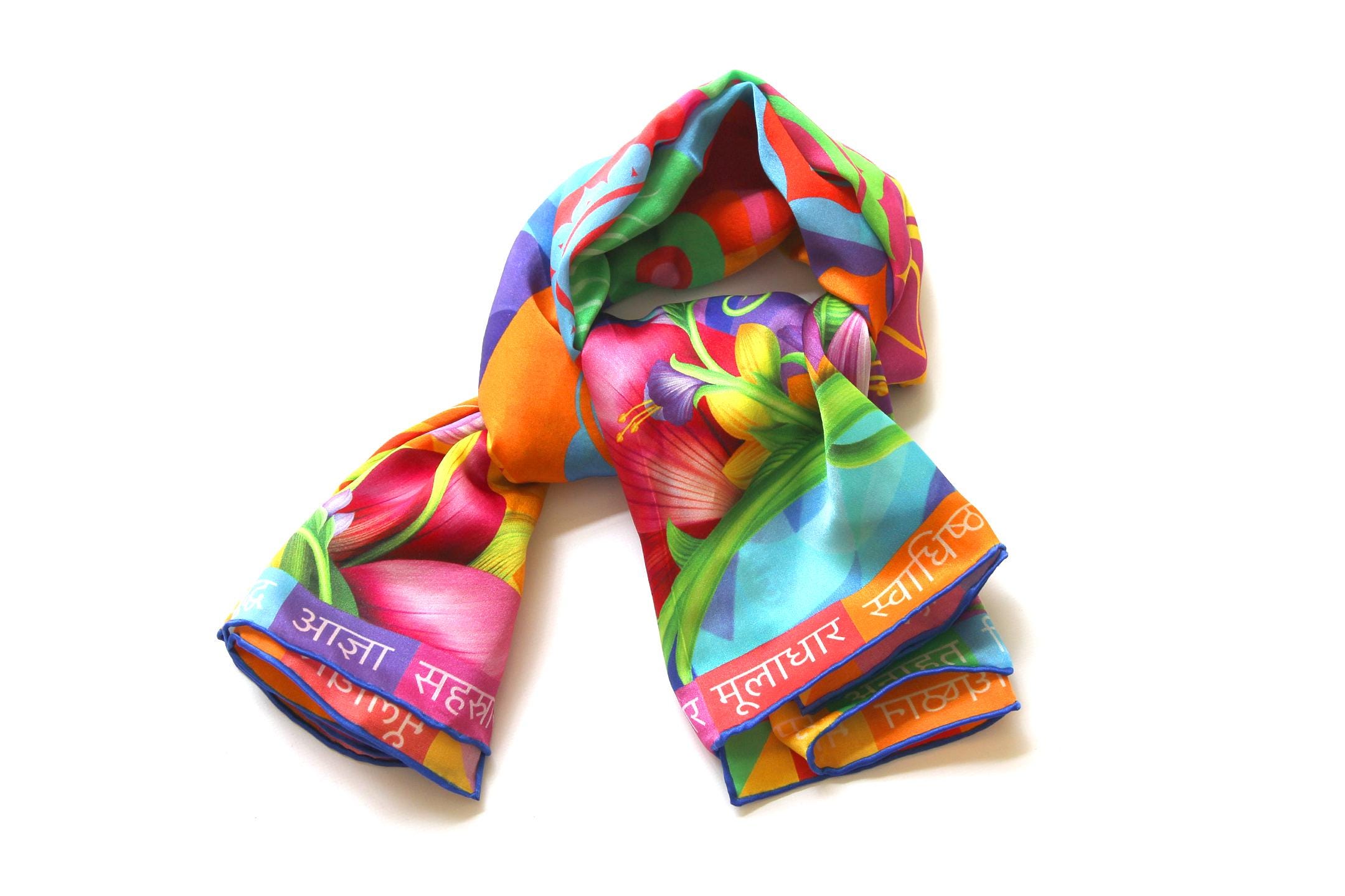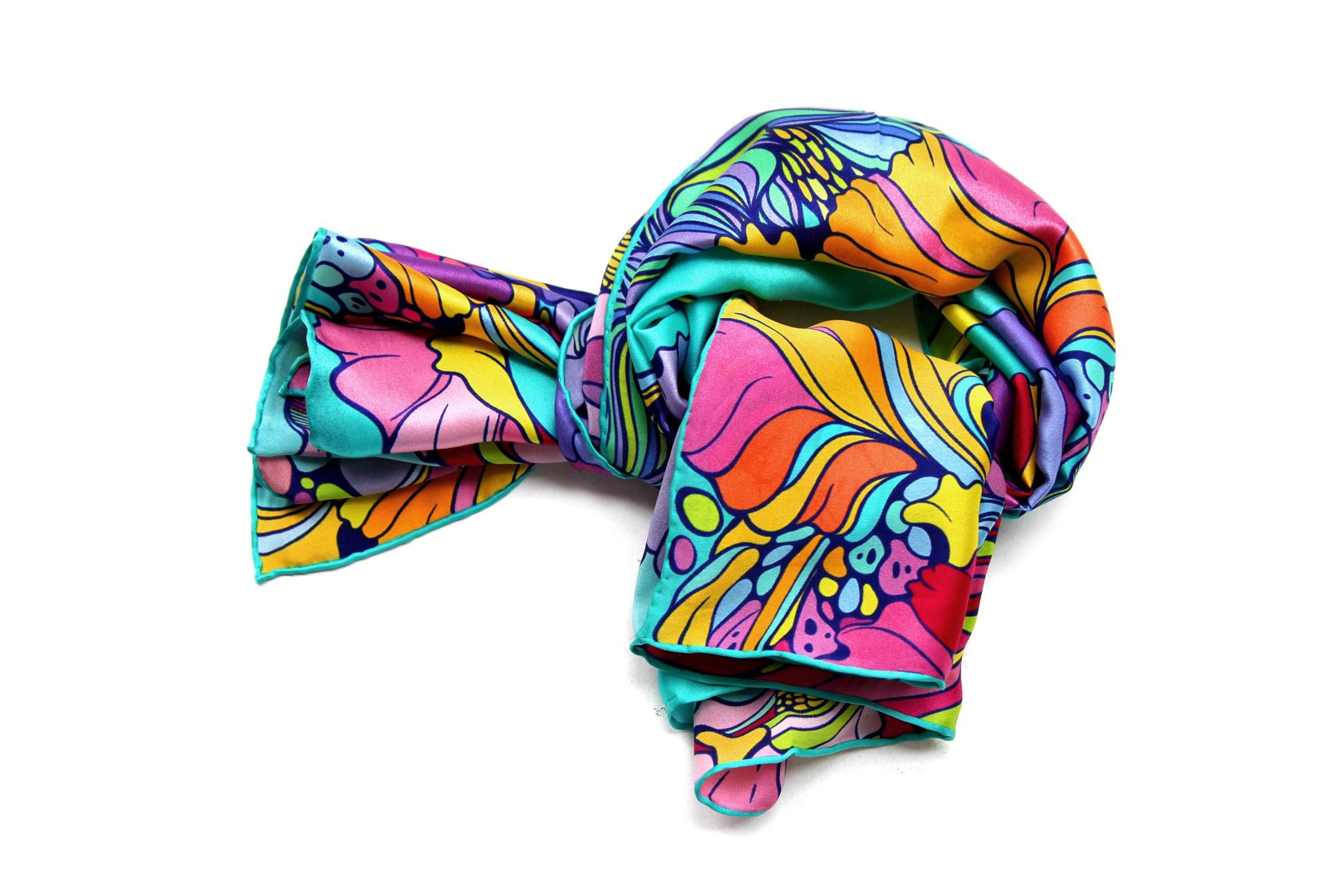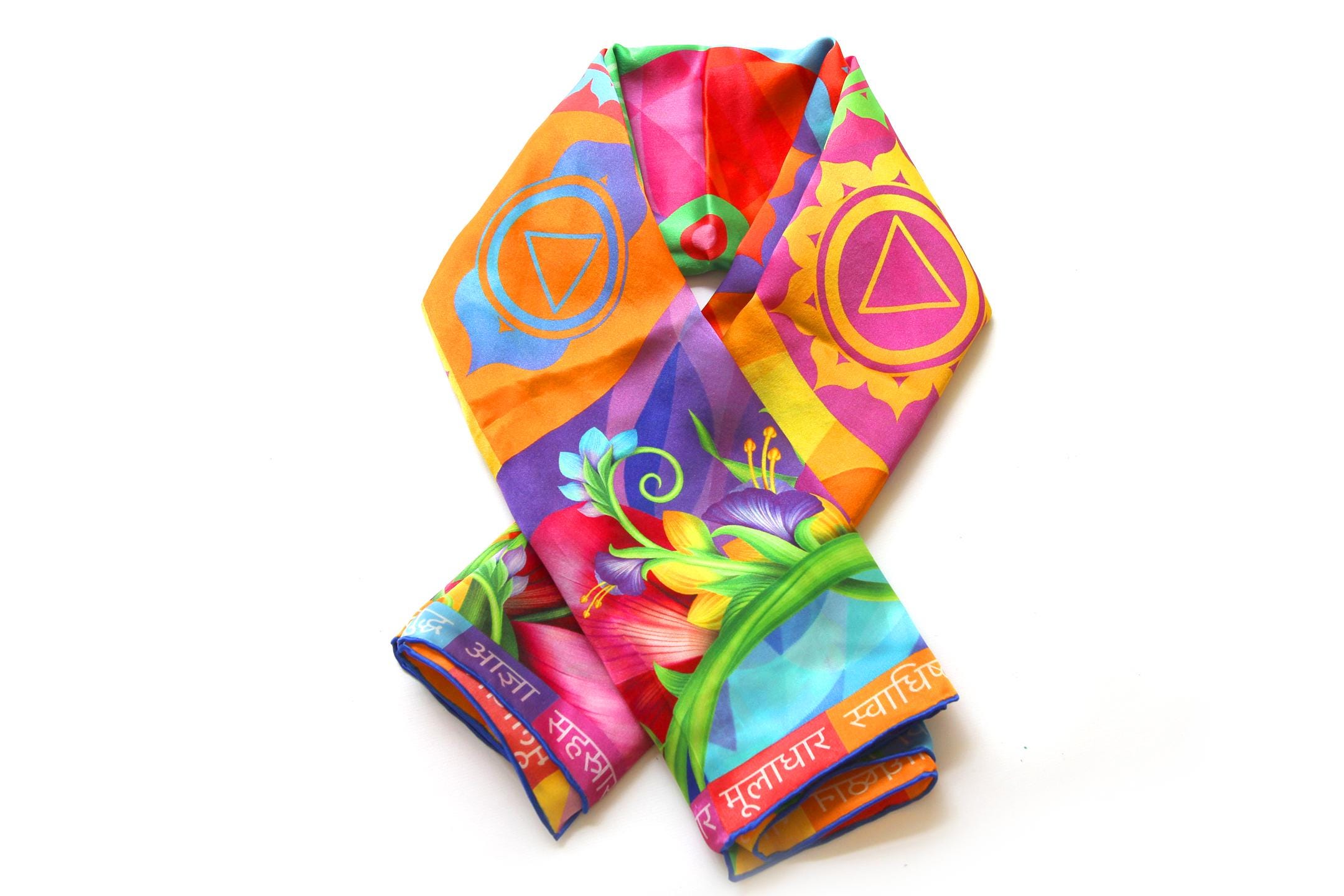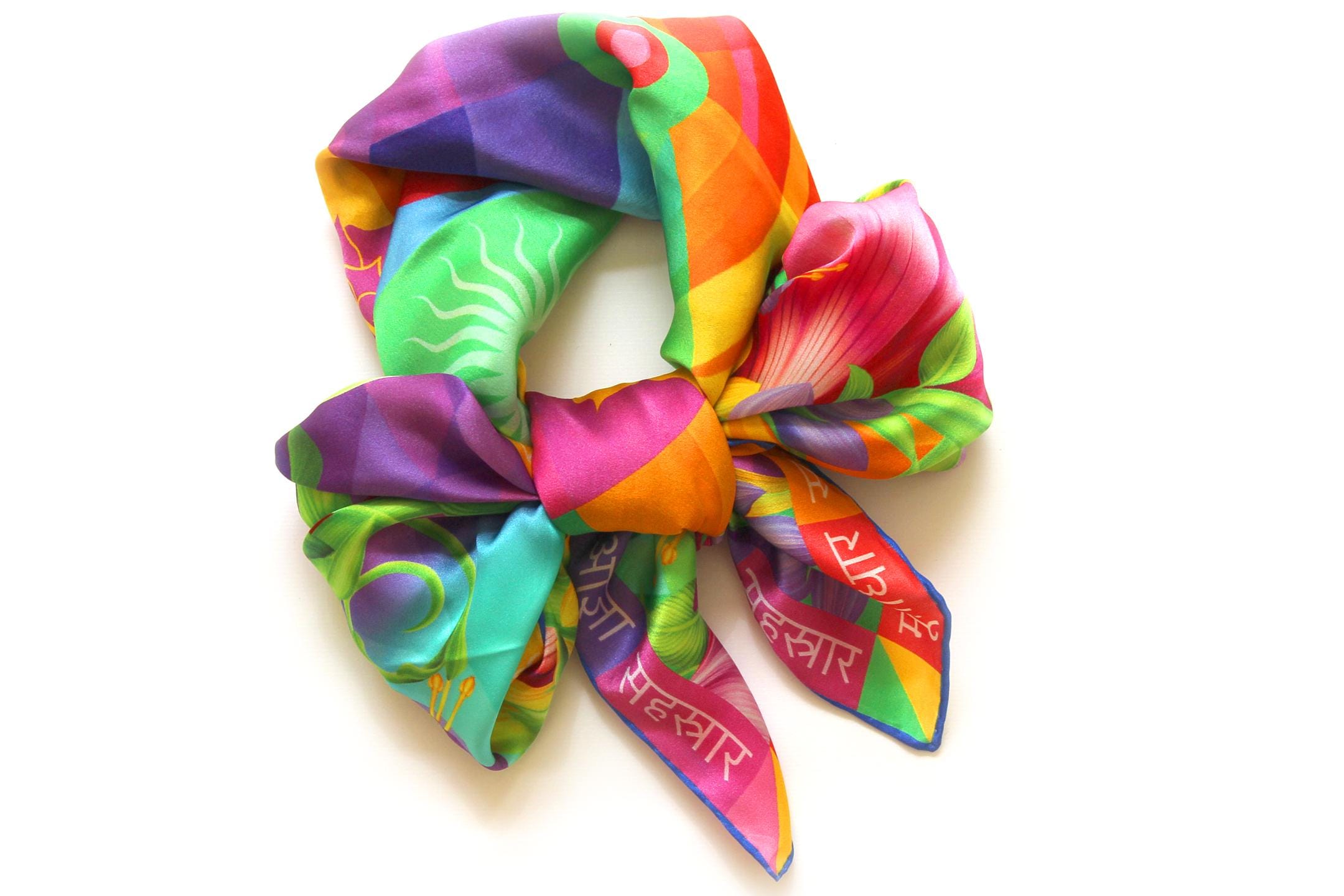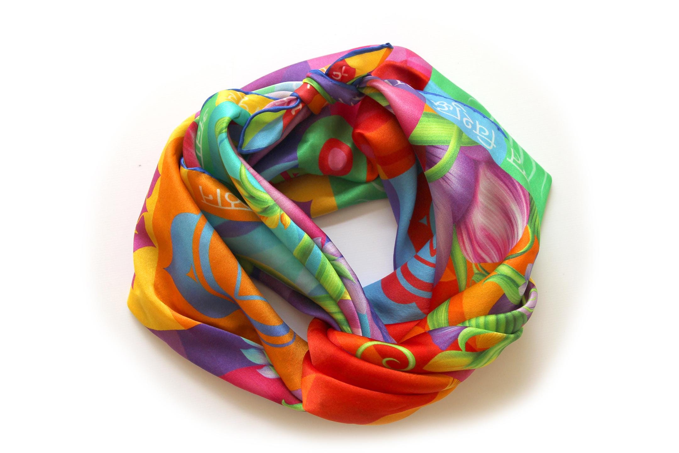 Fold your silk scarf to a triangle: With triangle pointing down your chest, cross the ends on the back of your neck and pull them to rest on your chest. If the scarf has a symmetrical design relying on a repetitive pattern, same in every quarter, this loop ends up nondescript and banal. However with the Palace Affair scarves, featuring organic and asymetrical distribution of design elements and color, this is a great tie, bringing together contrasting or complementary colors and swirls of imagery from different quarters of the scarf.