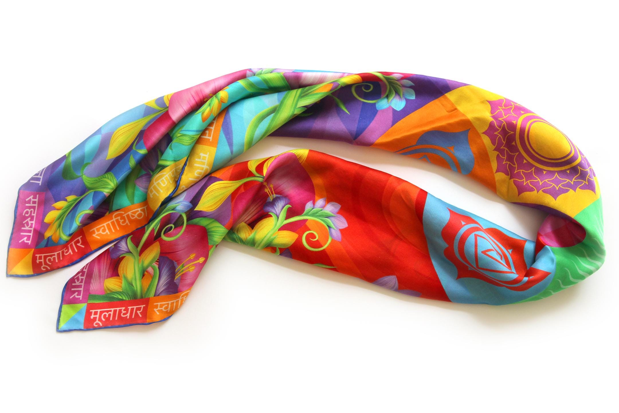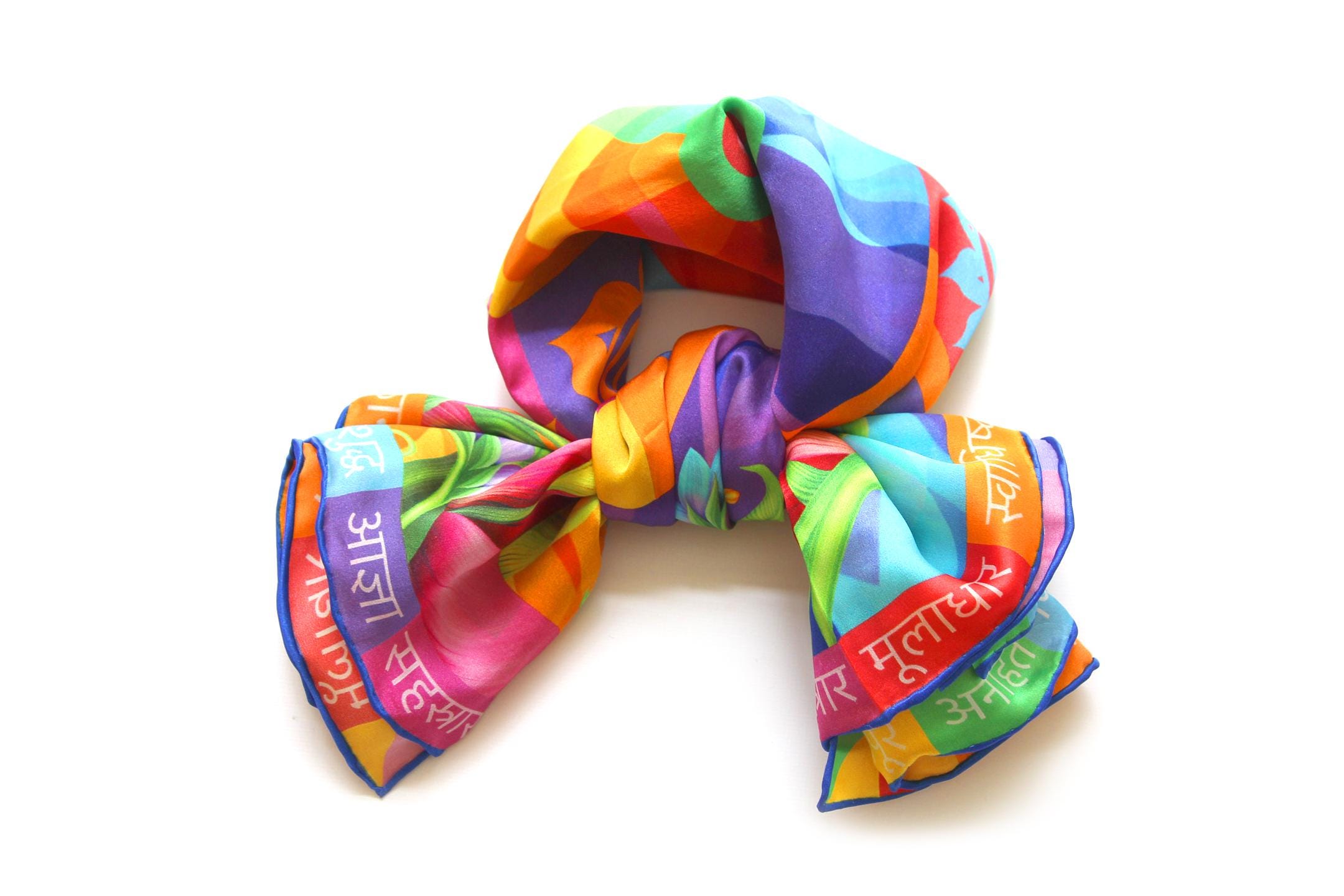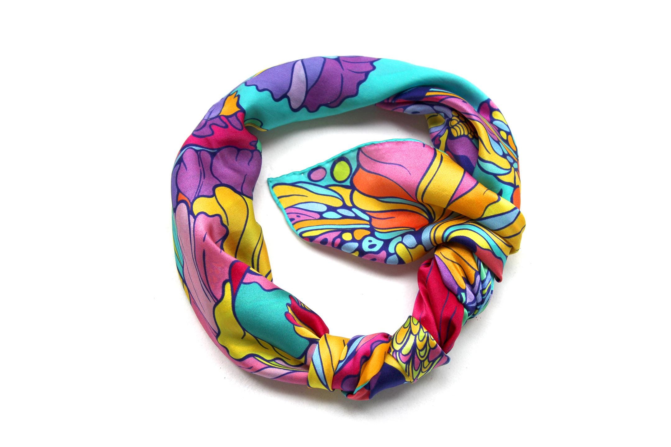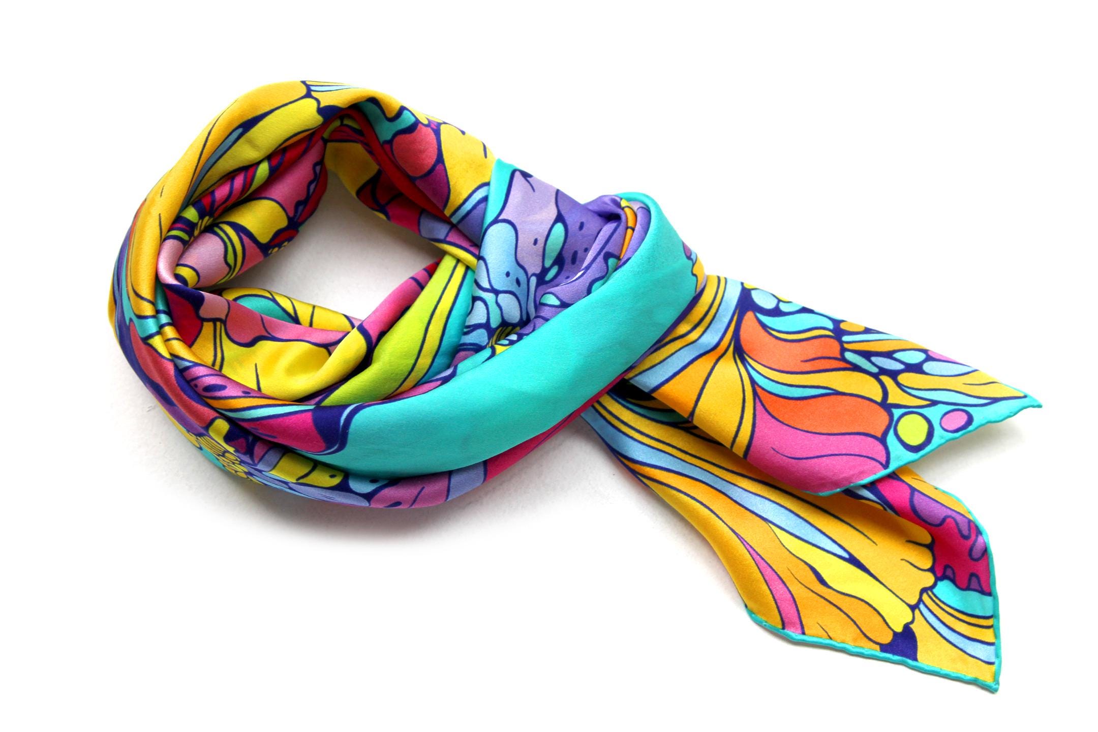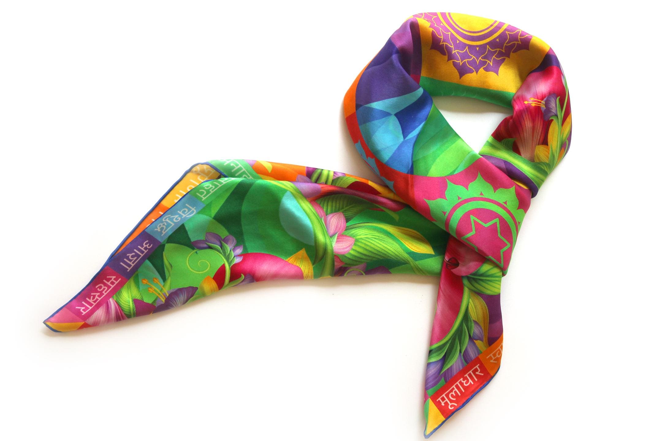 Fold your silk scarf to a triangle: With triangle pointing down your chest, cross the ends on the back of your neck and pull them to rest on your chest. If the scarf has a symmetrical design relying on a repetitive pattern, same in every quarter, this loop ends up nondescript and banal. However with the Palace Affair scarves, featuring organic and asymetrical distribution of design elements and color, this is a great tie, bringing together contrasting or complementary colors and swirls of imagery from different quarters of the scarf.