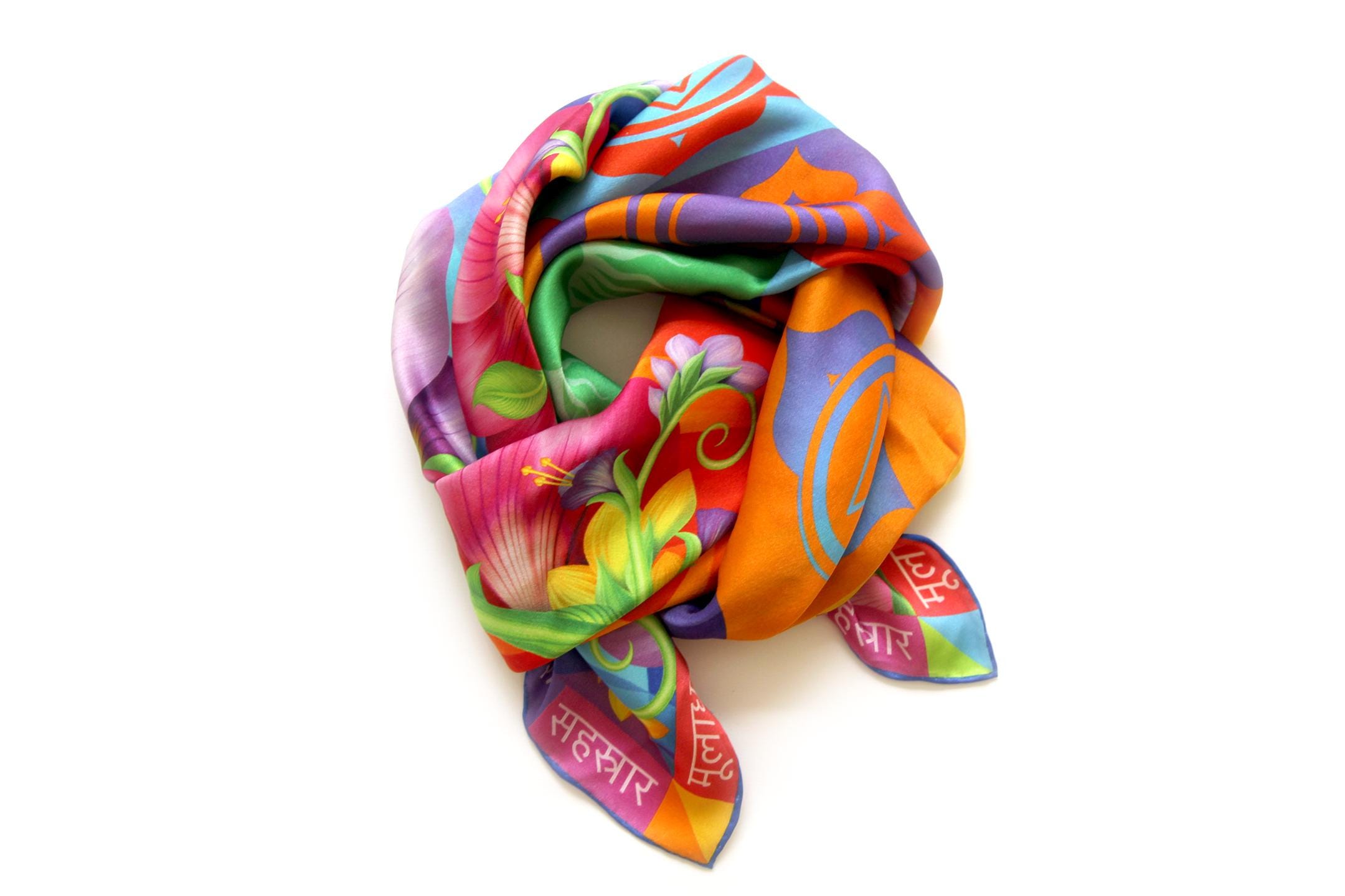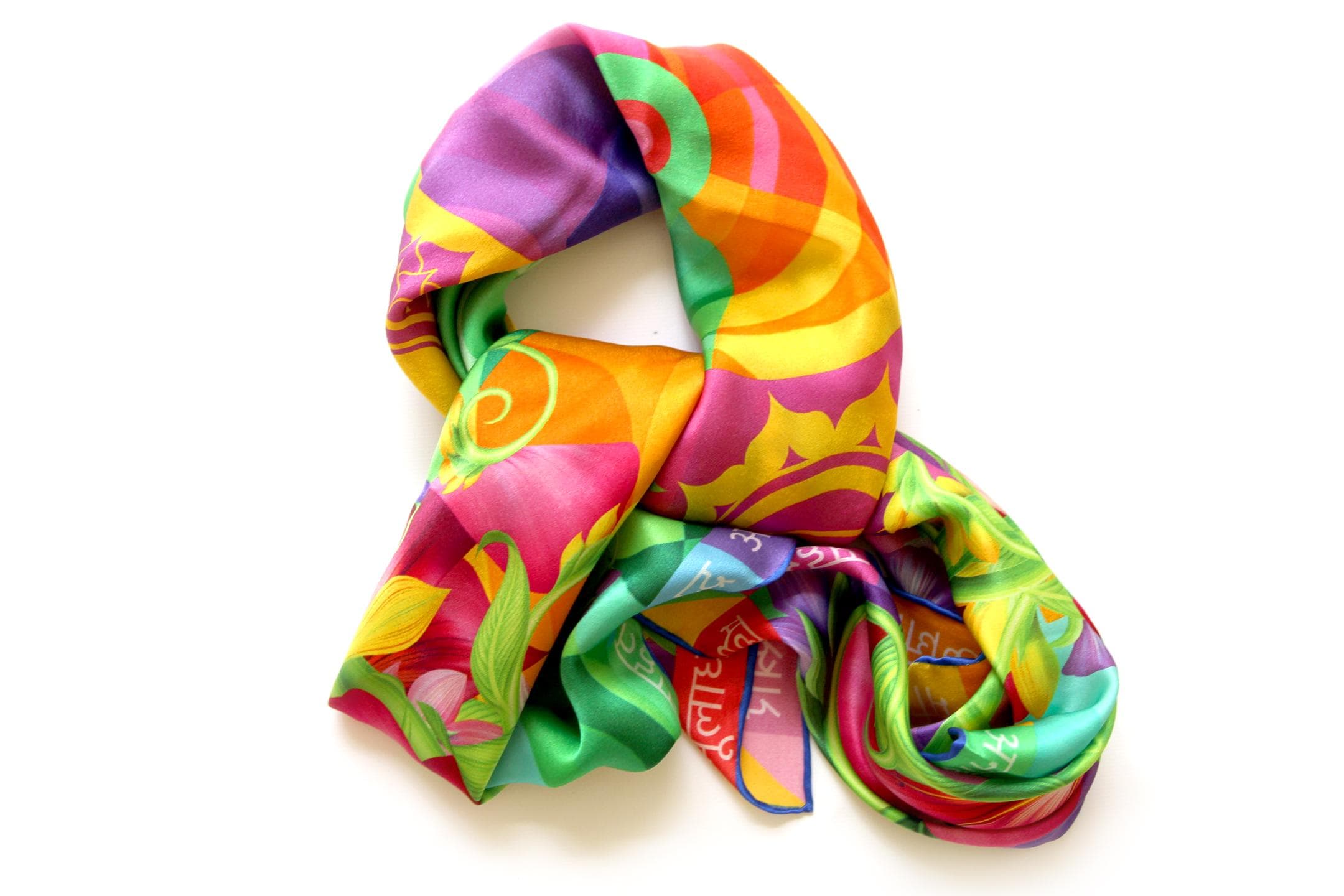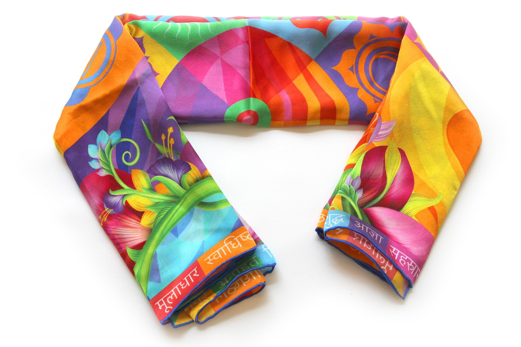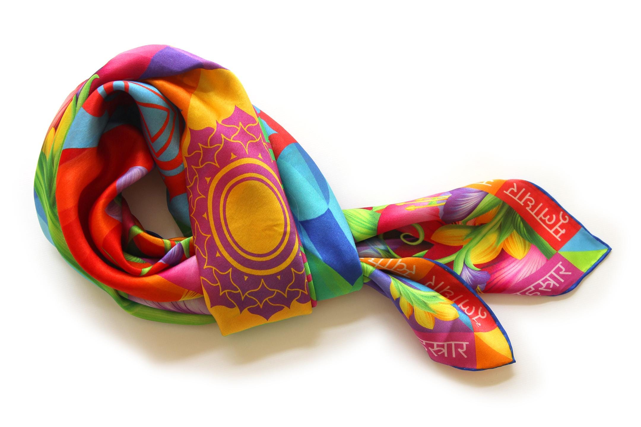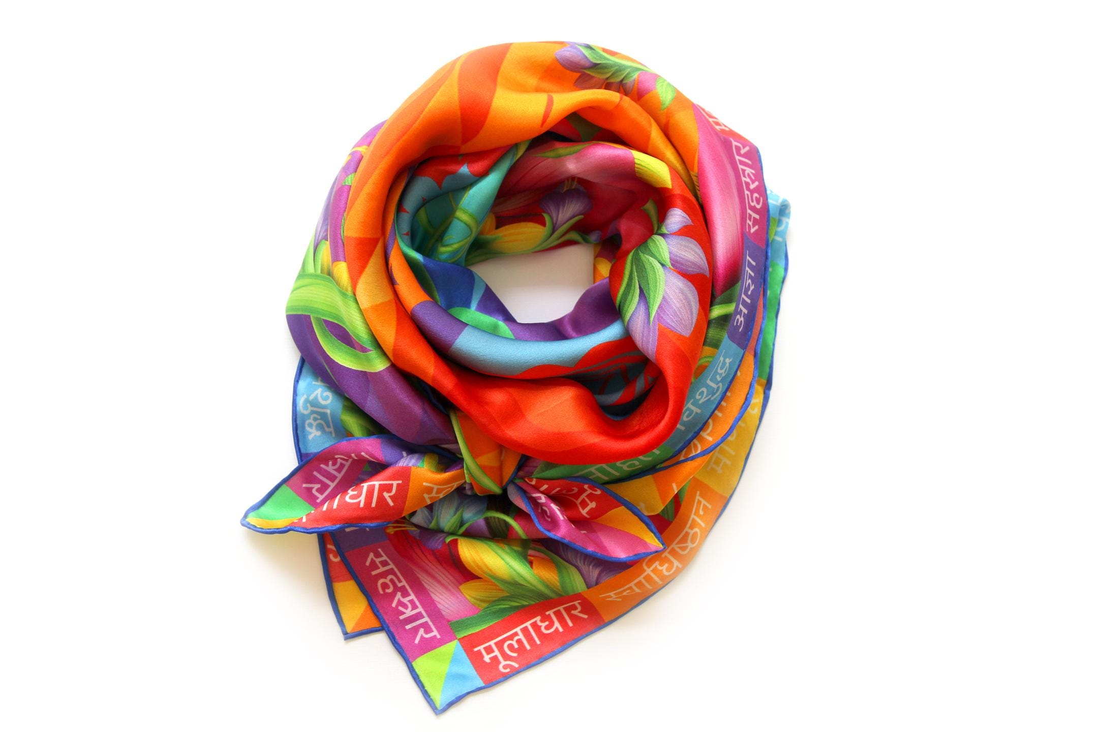 Fold your silk scarf to a triangle: With triangle pointing down your chest, cross the ends on the back of your neck and pull them to rest on your chest. If the scarf has a symmetrical design relying on a repetitive pattern, same in every quarter, this loop ends up nondescript and banal. However with the Palace Affair scarves, featuring organic and asymetrical distribution of design elements and color, this is a great tie, bringing together contrasting or complementary colors and swirls of imagery from different quarters of the scarf.