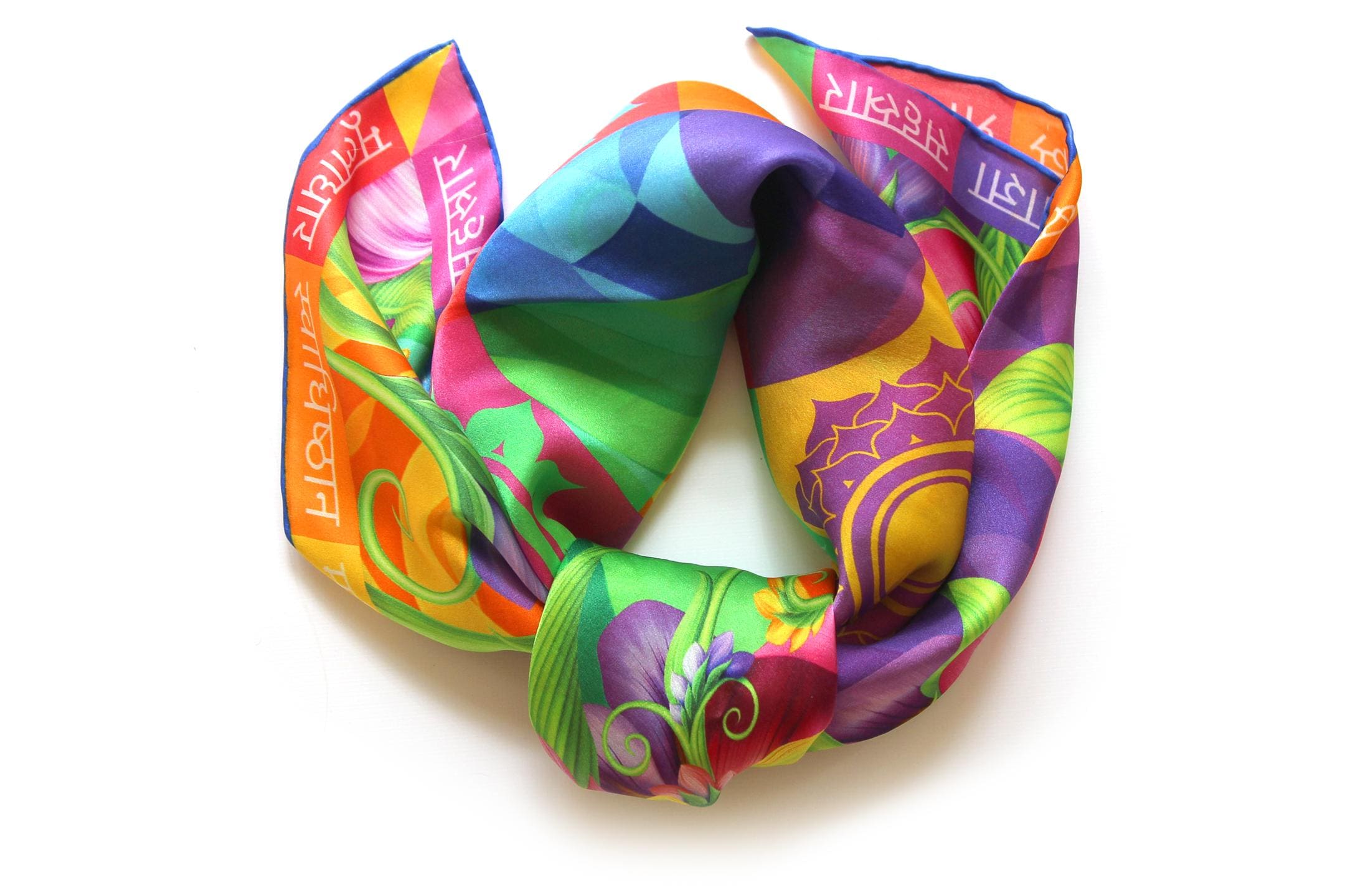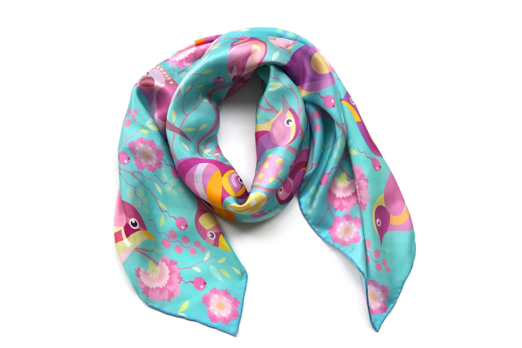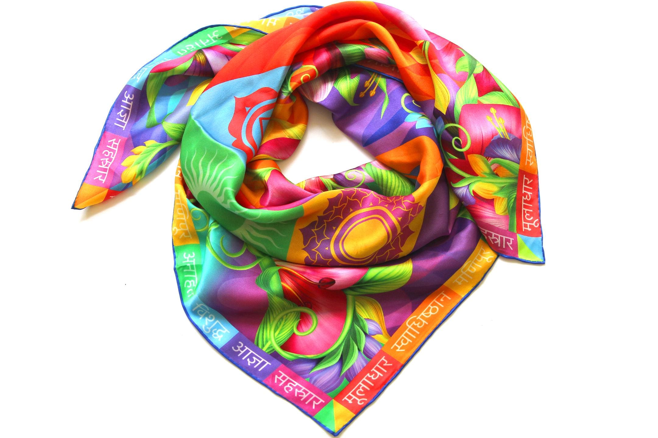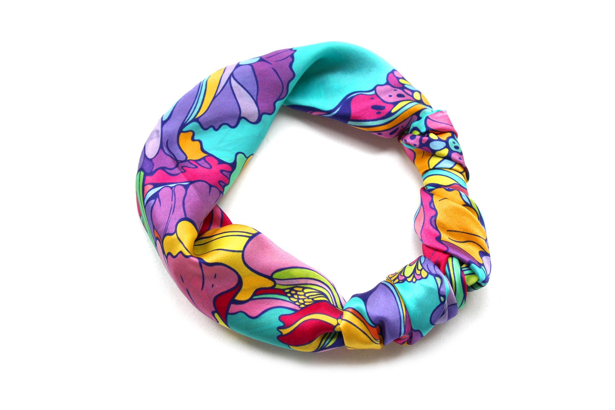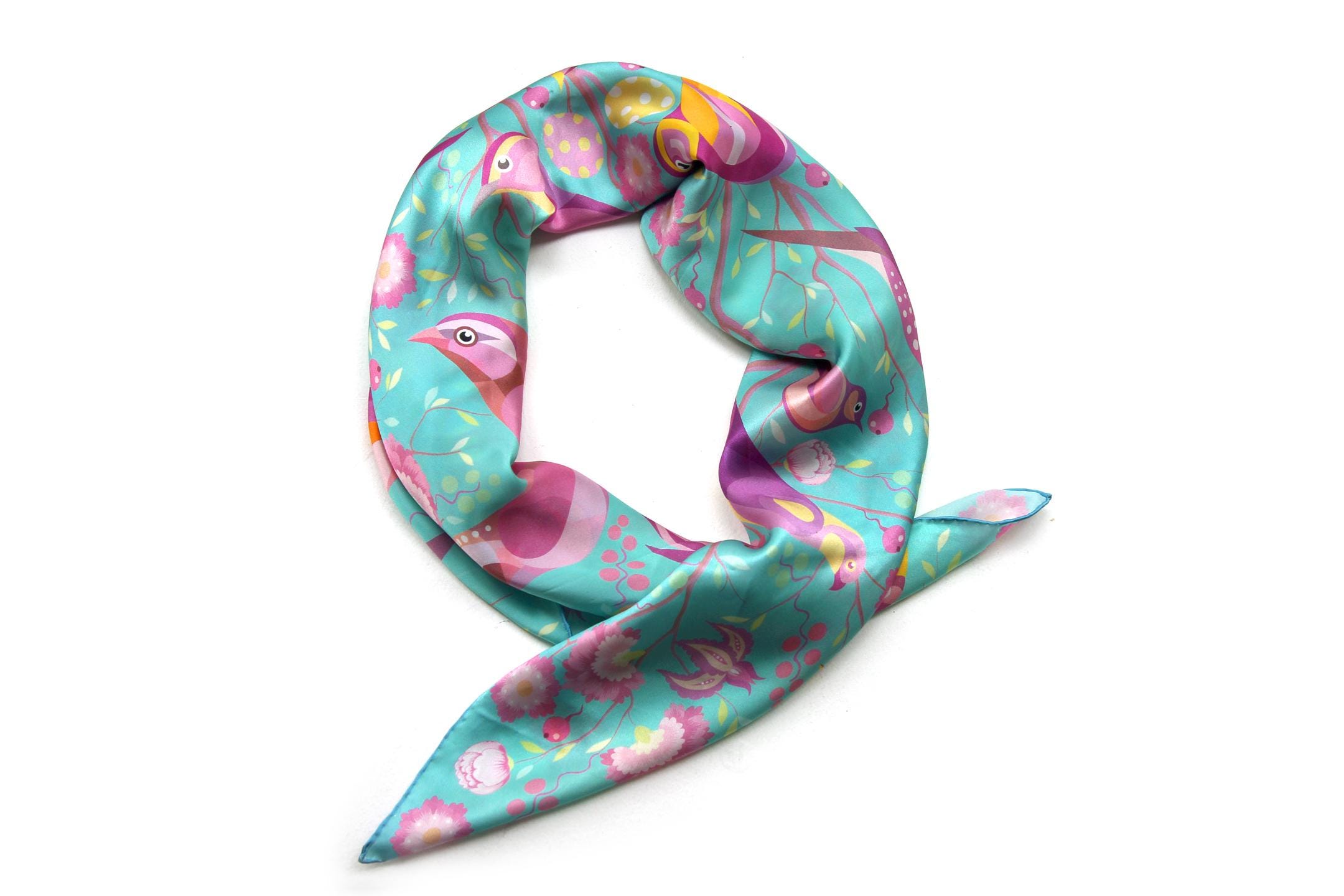 Fold your silk scarf to a triangle: With triangle pointing down your chest, cross the ends on the back of your neck and pull them to rest on your chest. If the scarf has a symmetrical design relying on a repetitive pattern, same in every quarter, this loop ends up nondescript and banal. However with the Palace Affair scarves, featuring organic and asymetrical distribution of design elements and color, this is a great tie, bringing together contrasting or complementary colors and swirls of imagery from different quarters of the scarf.