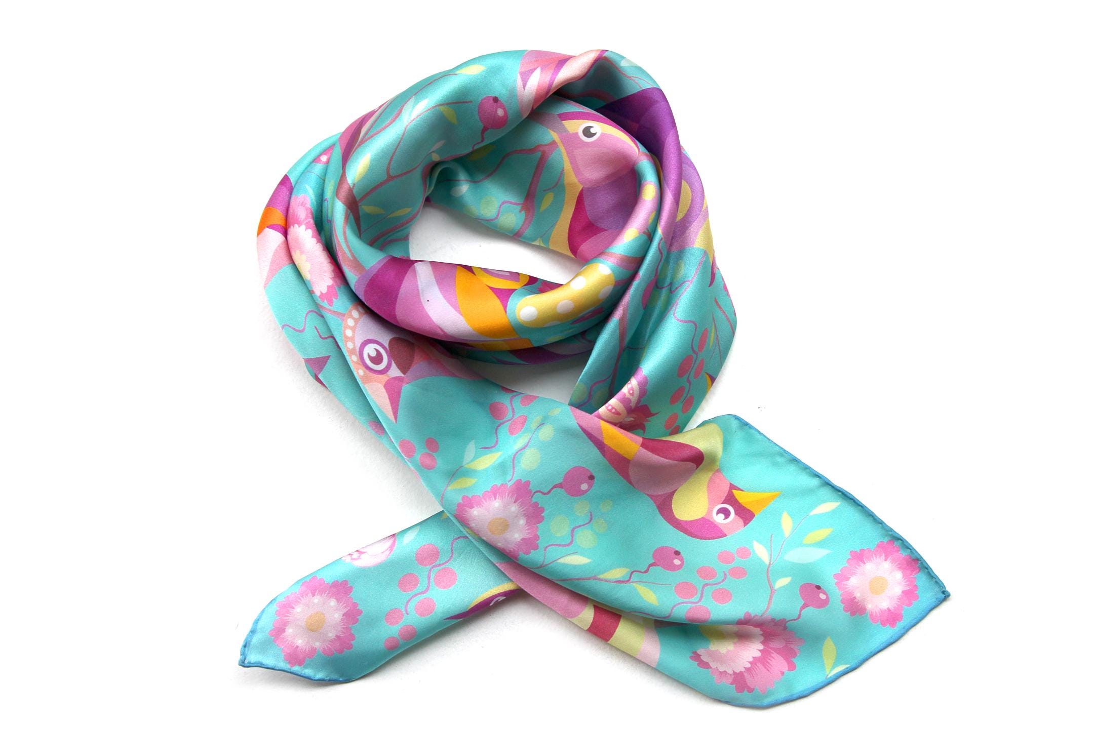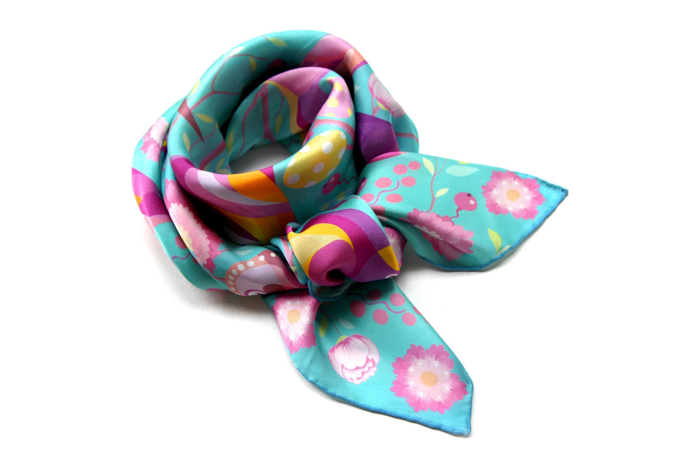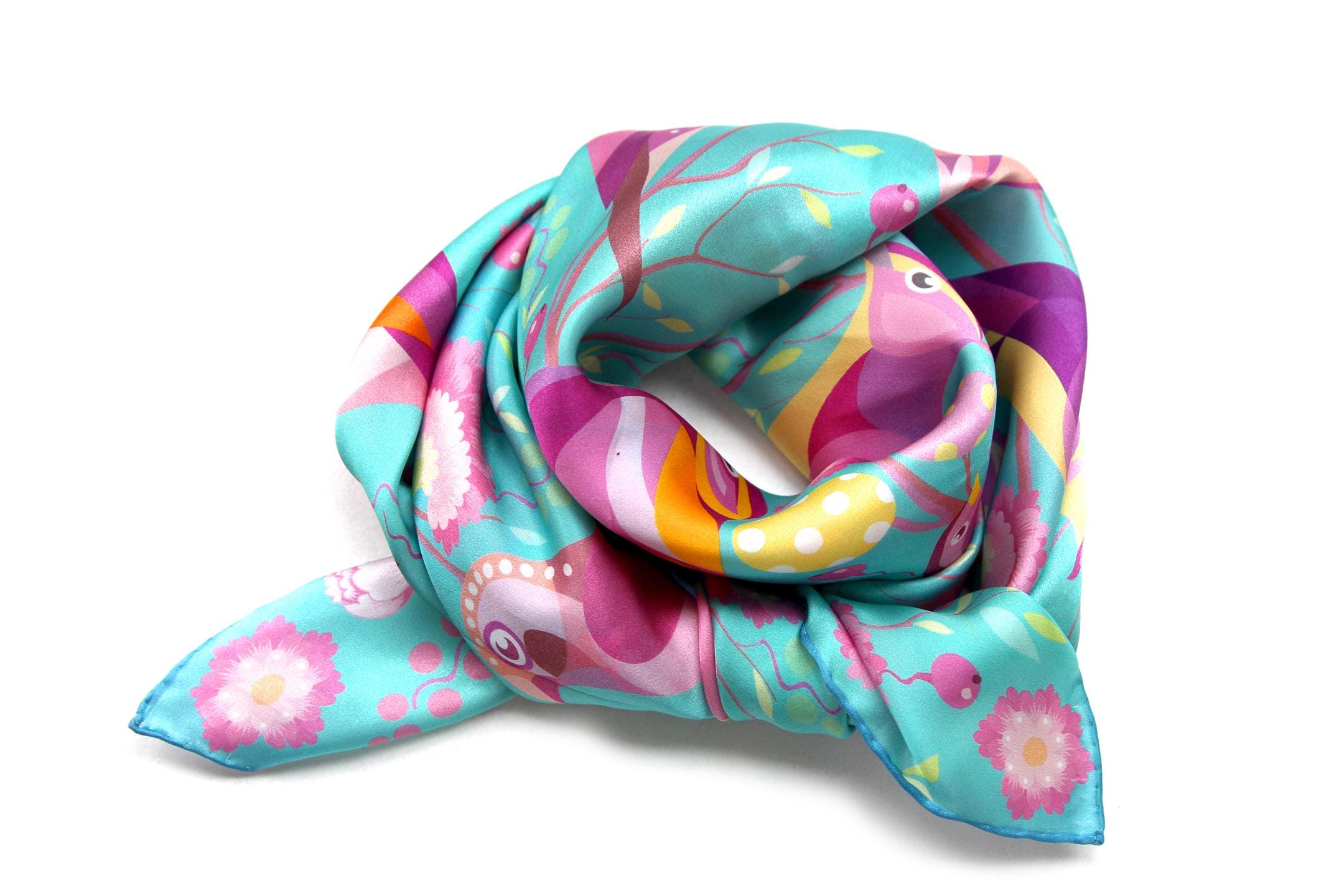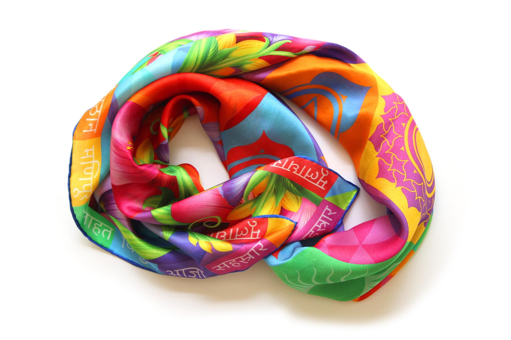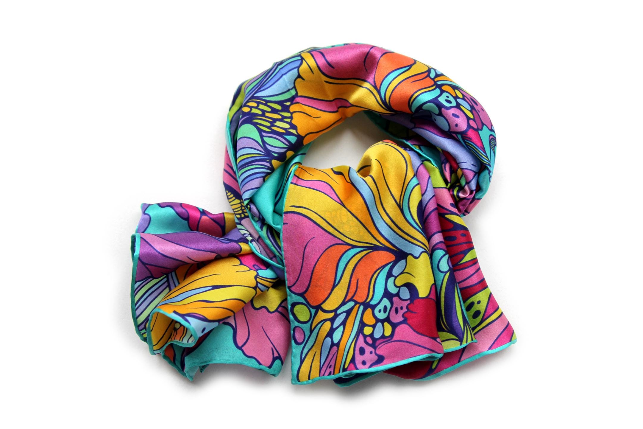 Fold your silk scarf to a triangle: With triangle pointing down your chest, cross the ends on the back of your neck and pull them to rest on your chest. If the scarf has a symmetrical design relying on a repetitive pattern, same in every quarter, this loop ends up nondescript and banal. However with the Palace Affair scarves, featuring organic and asymetrical distribution of design elements and color, this is a great tie, bringing together contrasting or complementary colors and swirls of imagery from different quarters of the scarf.